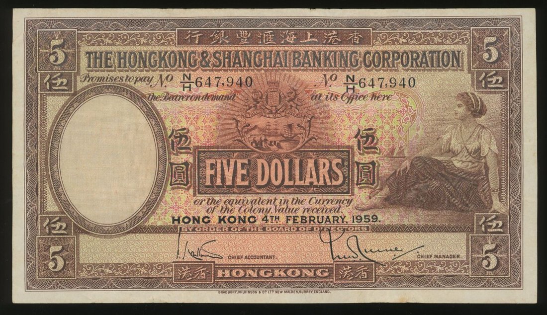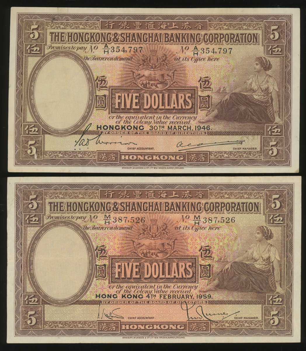 The Hongkong and Shanghai Banking Corporation, a group of 5x $5, 1941(2) 1946(1) and 1959(2), serial numbers M264797, P285897, A/H 354797, M/H 387526 and N/H 647940, (Pick 173d, 173e, 180b), crisp good very fine with minor toning (5).