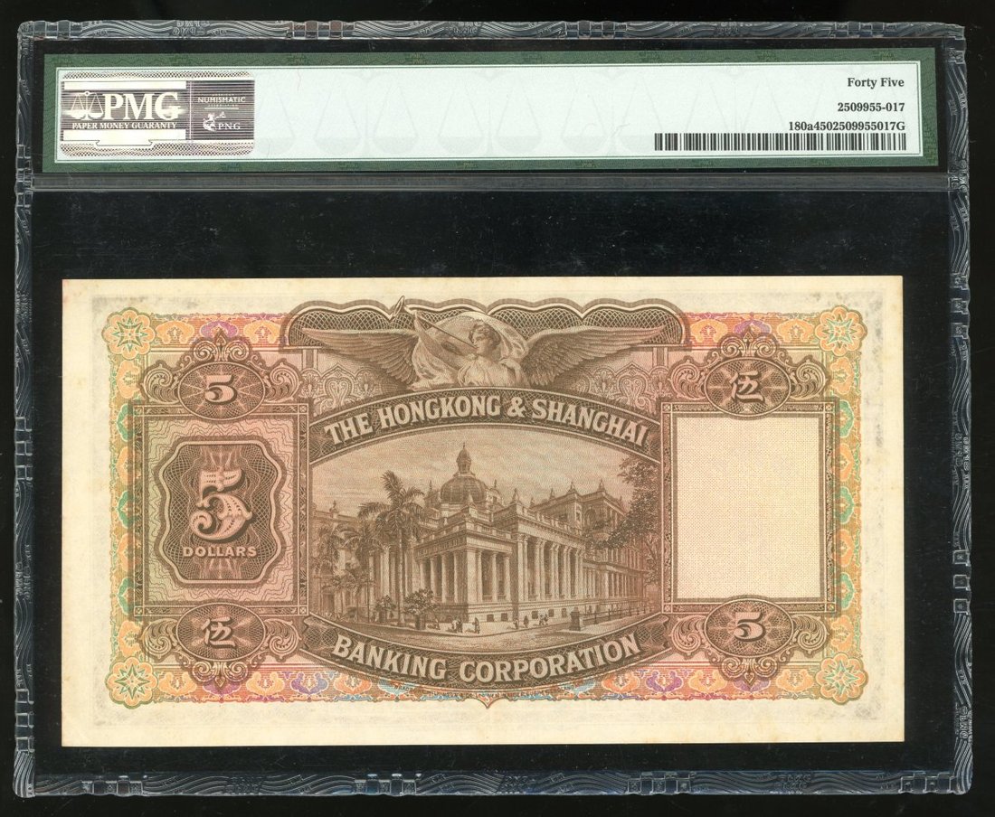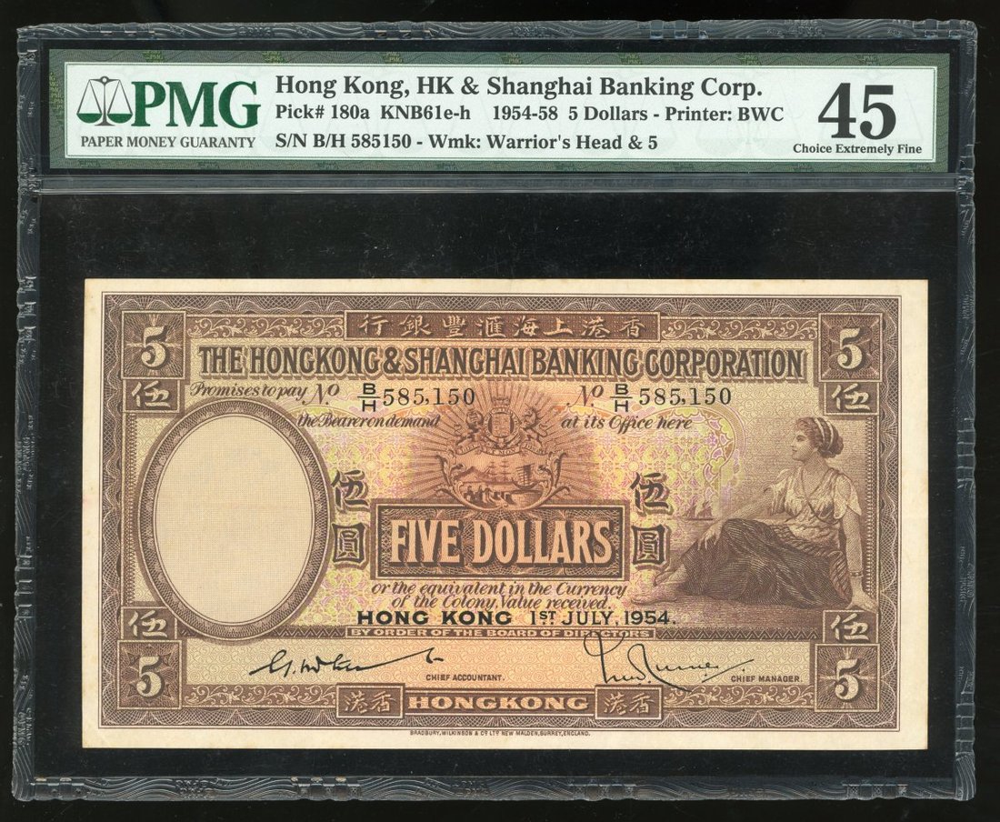 The Hongkong and Shanghai Banking Corporation, $5, 1.7.1954, serial number B/H 585150, (Pick 180a), PMG 45 Choice Extremely Fine and a post war key date