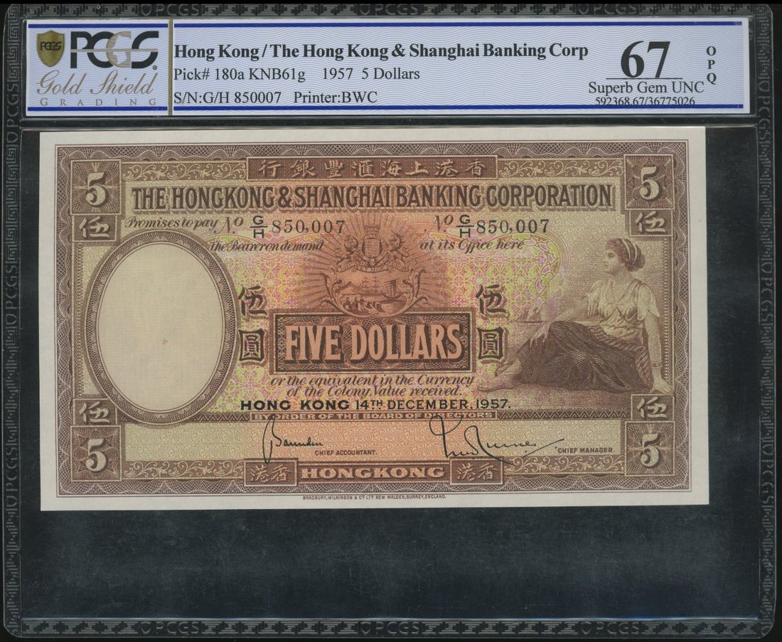 The Hongkong and Shanghai Banking Corporation, $5, 14.12.1957, serial number G/H 850,007, (Pick 180a), PCGS Gold Shield Grading 67OPQ Superb Gem Uncirculateed
