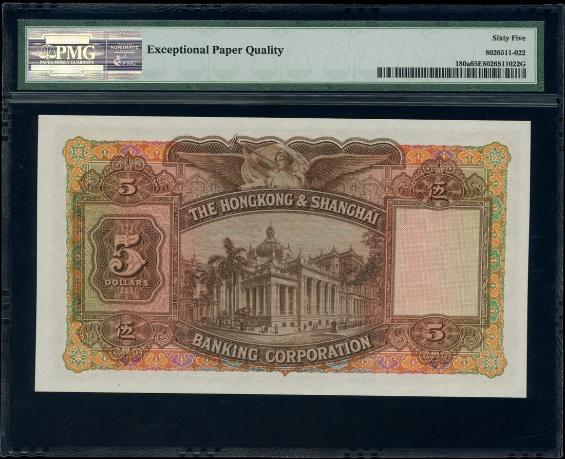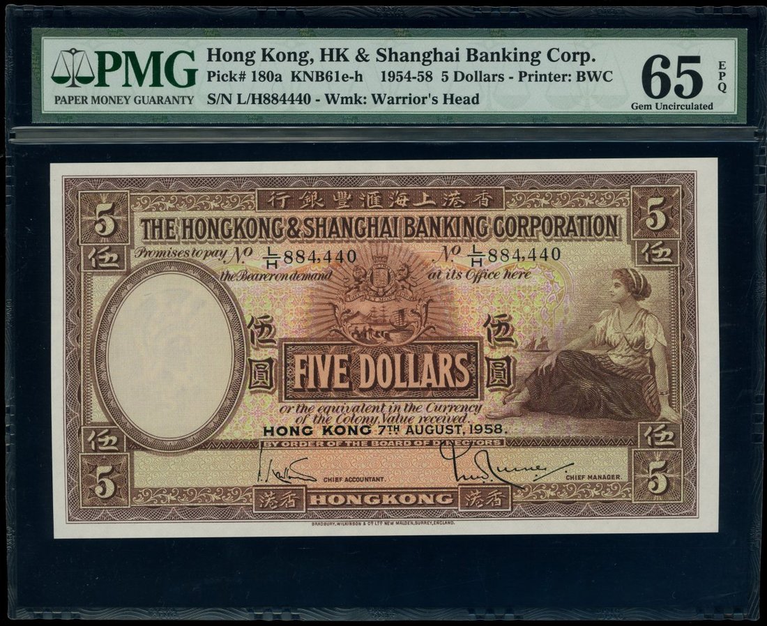 The Hongkong and Shanghai Banking Corporation, $5, 7.8.1958, serial number L/H 884440, (Pick 180a), PMG 65EPQ Gem Uncirculated.