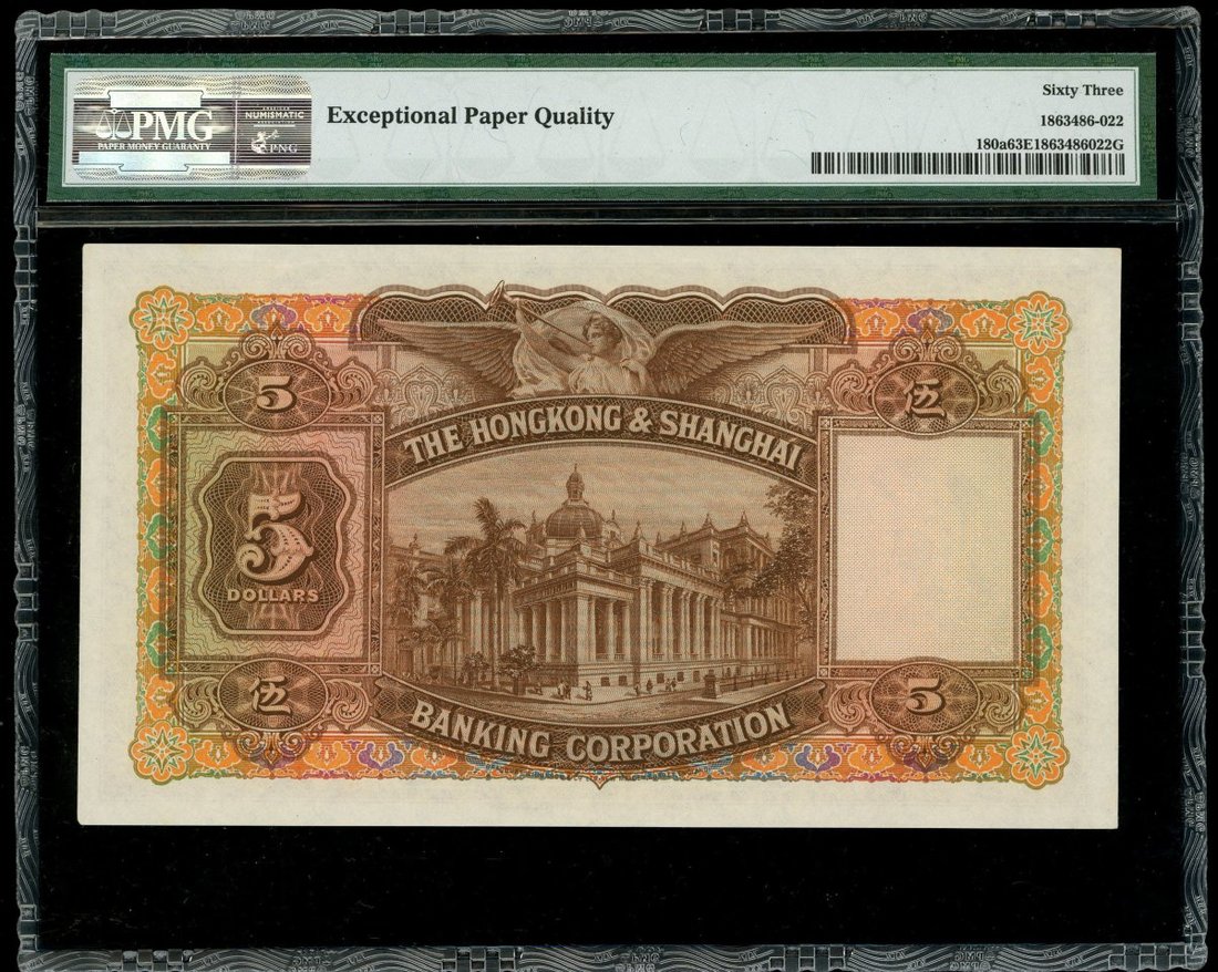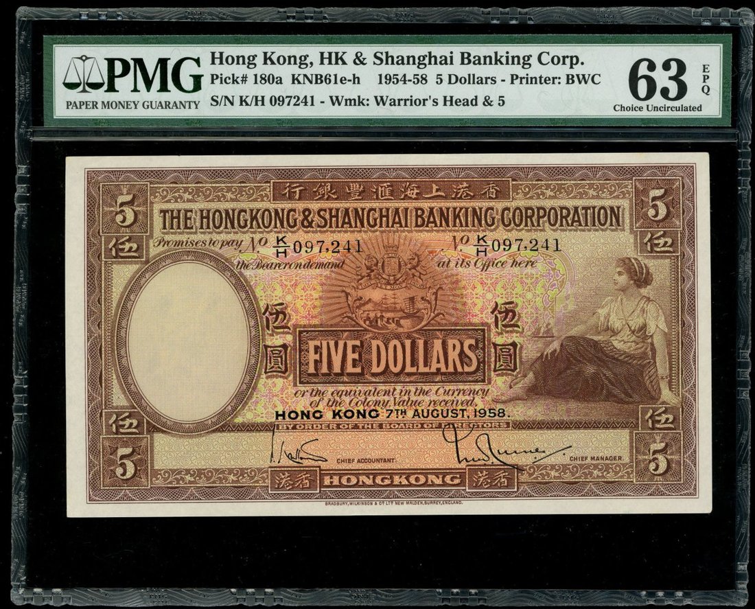 Hong Kong & Shanghai Banking Corporation, $5, 7.8.1958, serial number K/H097241, (Pick 180a), PMG 63EPQ.