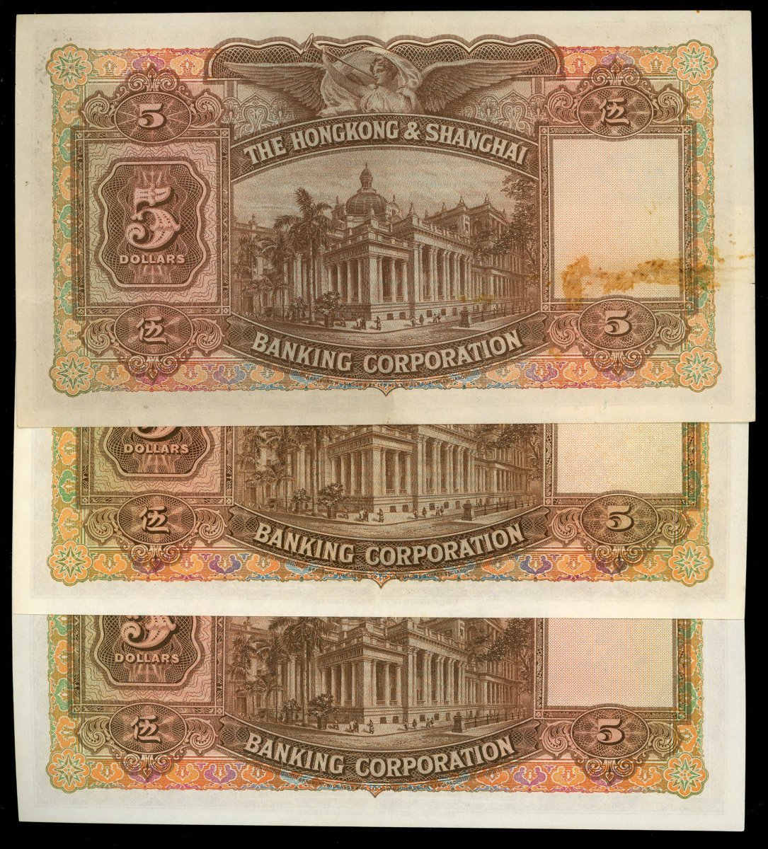 The Hongkong and Shanghai Banking Corporation, 3x $5, 1.7.1954, 14.12.1957 and 7.8.1958, serial numbers B/H 405088, J/H 123562 and M/H 035007, (Pick 180a), the 1954 good extremely fine, the other two about uncirculated (3)