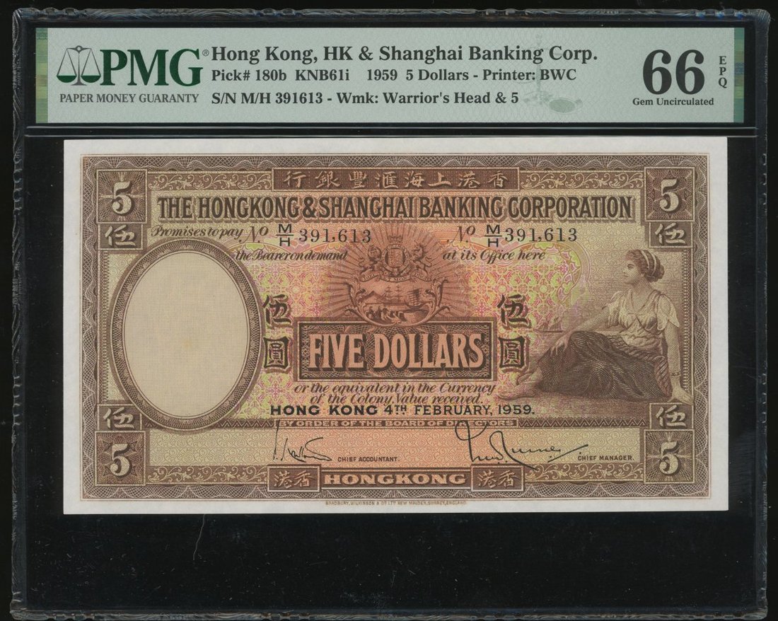 The Hongkong and Shanghai Banking Corporation, $5, 4.2.1959, serial number M/H 391613, (Pick 180b), PMG 66EPQ Gem Uncirculated