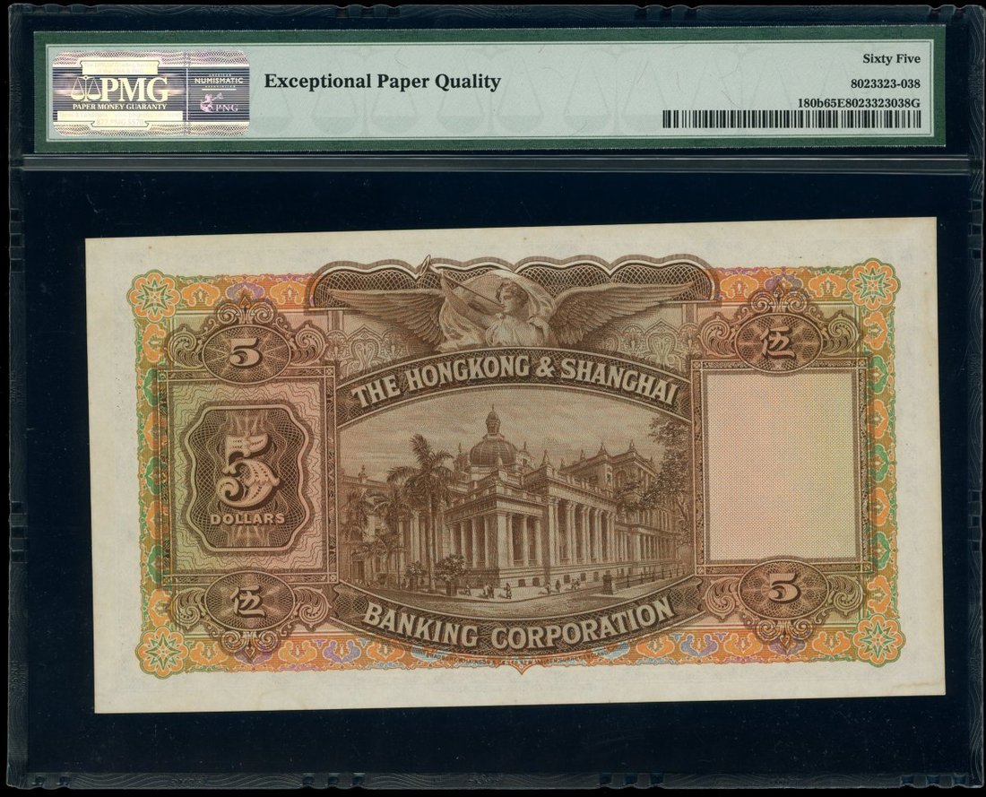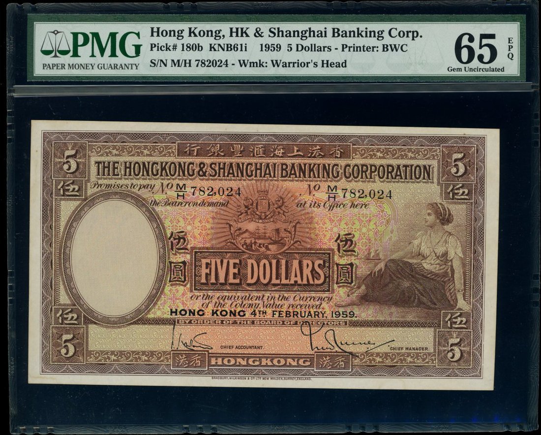 The Hongkong and Shanghai Banking Corporation, $5, 4.2.1959, serial number M/H 782024, (Pick 180b), PMG 65EPQ Gem Uncirculated.