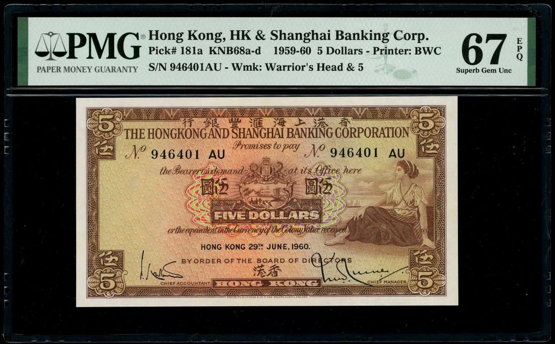 The Hongkong and Shanghai Banking Corporation, $5, 29.6.1960, serial number 946401 AU, (Pick 181a), PMG 67EPQ Superb Gem Uncirculated