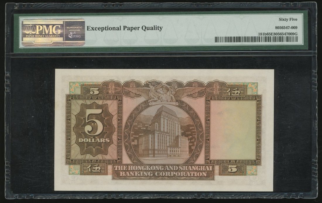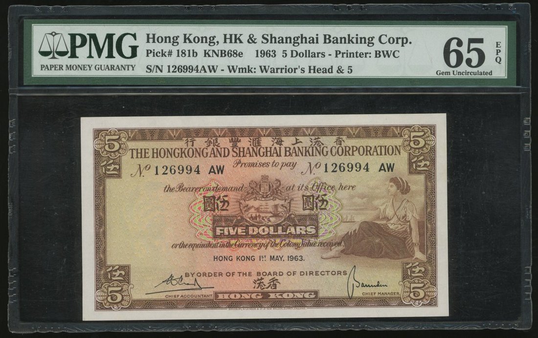 The Hongkong and Shanghai Banking Corporation, $5, 1.5.1963, serial number 126994AW, (Pick 181b), PMG 65EPQ Gem Uncirculated and key date of the series with only 400,000 notes printed. Rare.