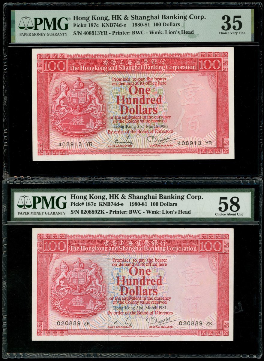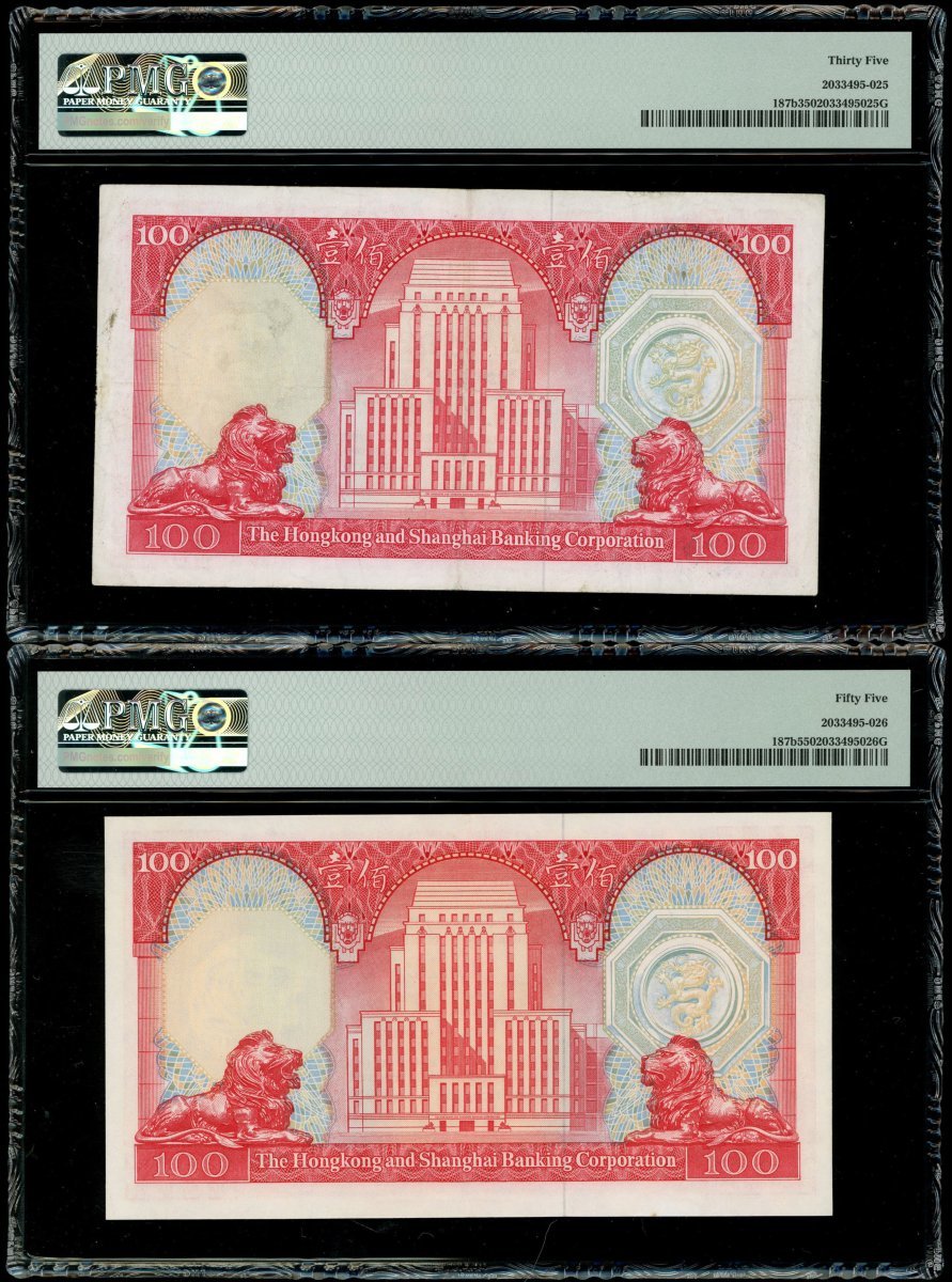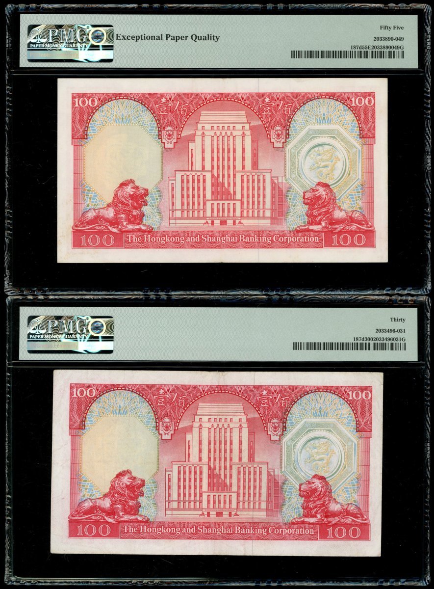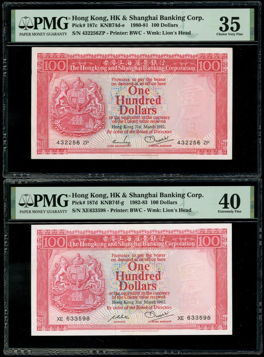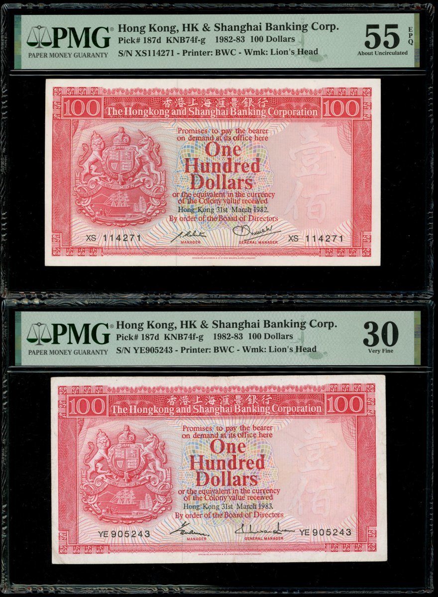 1977至1983年香港上海匯豐銀行100元大全套一組10枚,編號870432XF,988243XU,730278XY,933671XW,408913YR,020889ZK,432256ZP,XE633598,XS114271及YE905243,PMG 25至55EPQ