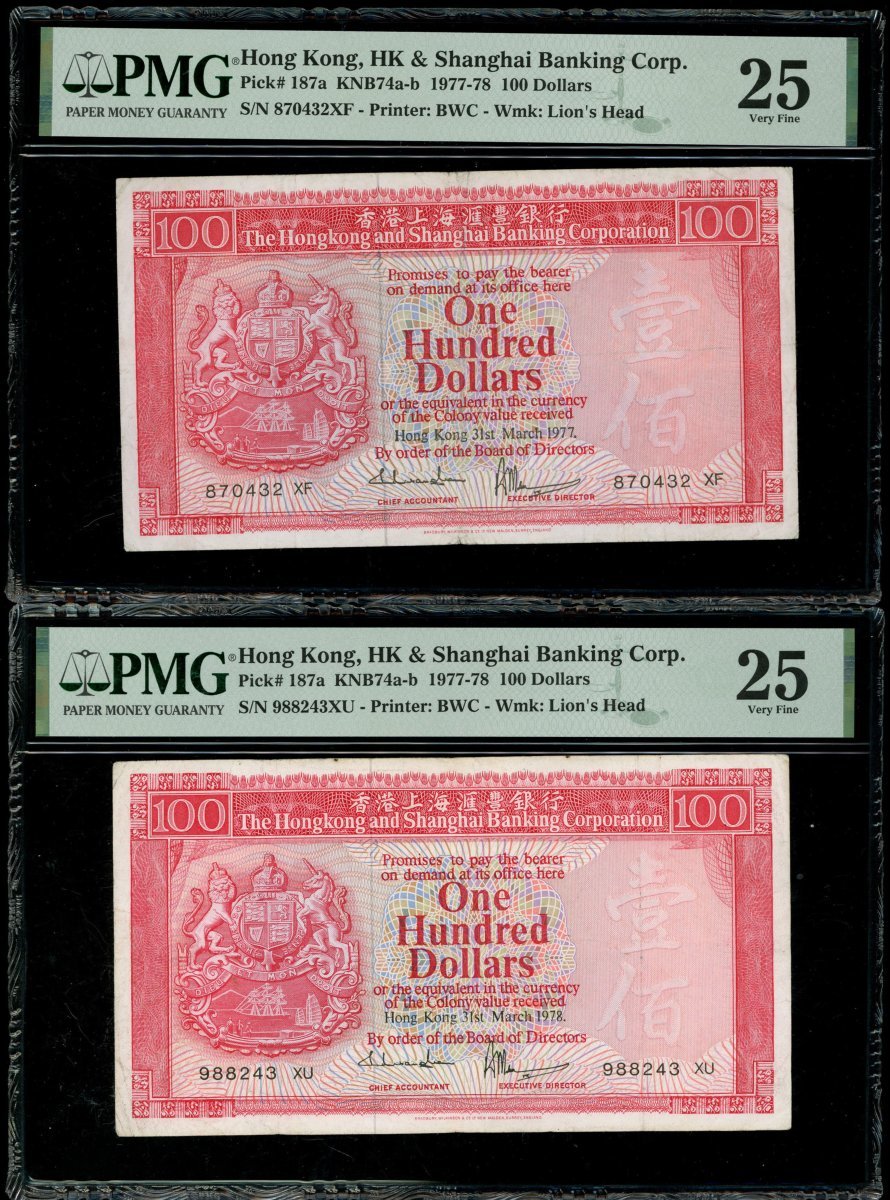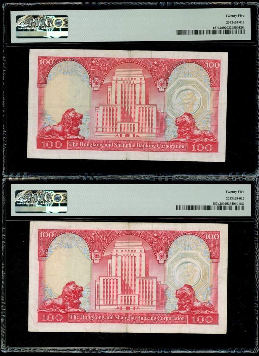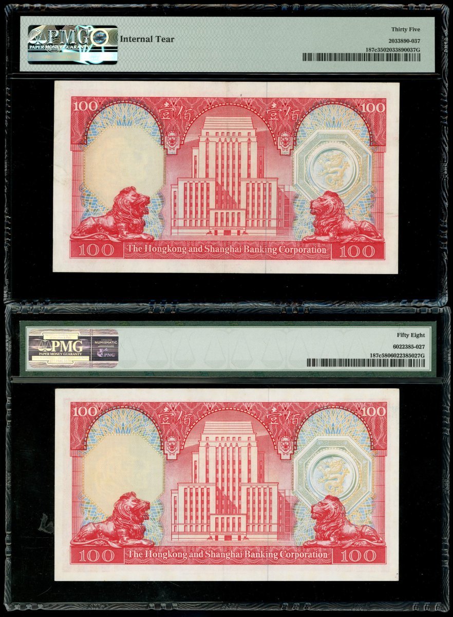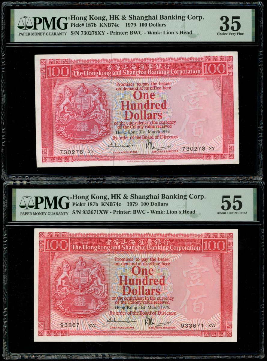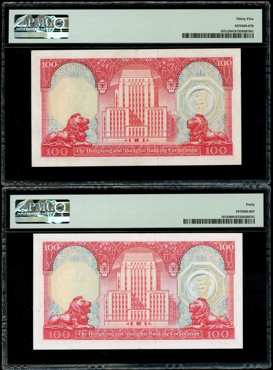 1977至1983年香港上海匯豐銀行100元大全套一組10枚,編號870432XF,988243XU,730278XY,933671XW,408913YR,020889ZK,432256ZP,XE633598,XS114271及YE905243,PMG 25至55EPQ