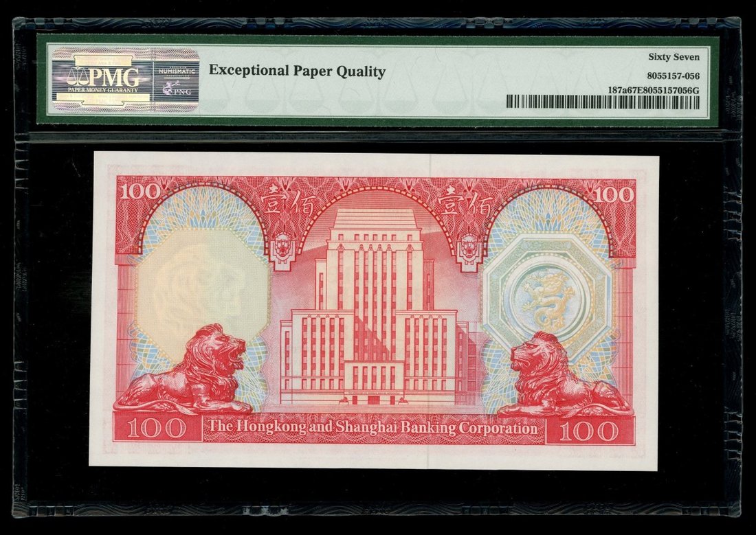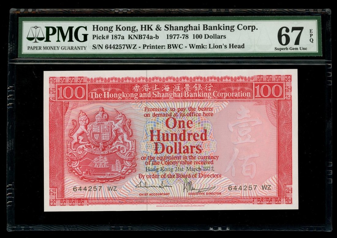 The Hongkong and Shanghai Banking Corporation, $100, 31.3.1977, serial number 644257WZ, (Pick 187a), PMG 67EPQ Superb Gem Uncirculated. A nice first year of issue