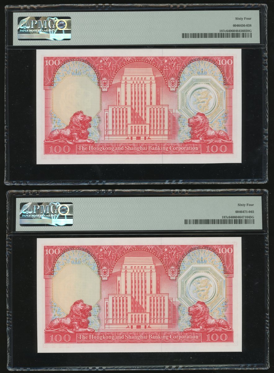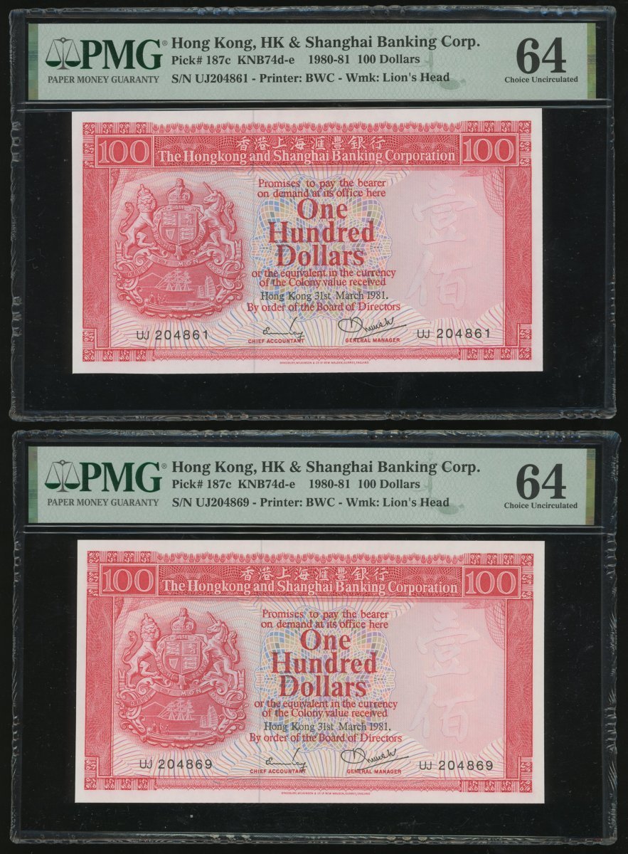 Hong Kong & Shanghai Banking Corporation, a pair of $100, 31.3.1981, serial number UJ2024861, 2024869, (Pick 187c), both PMG 64, choice uncirculated.(2)
