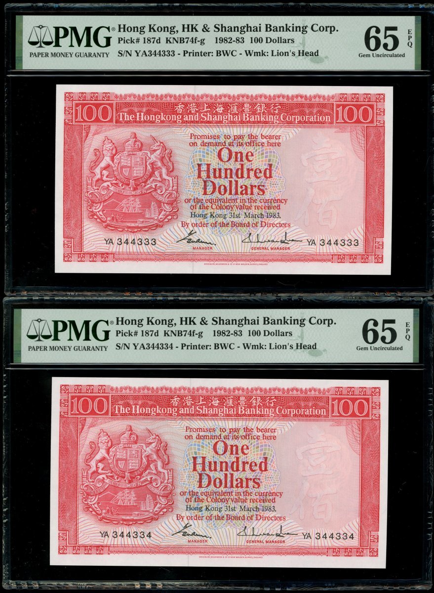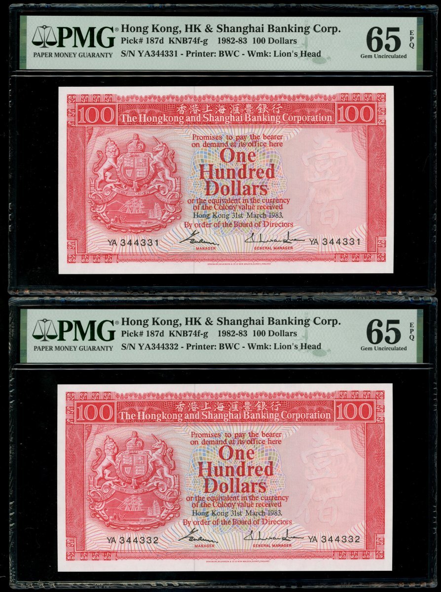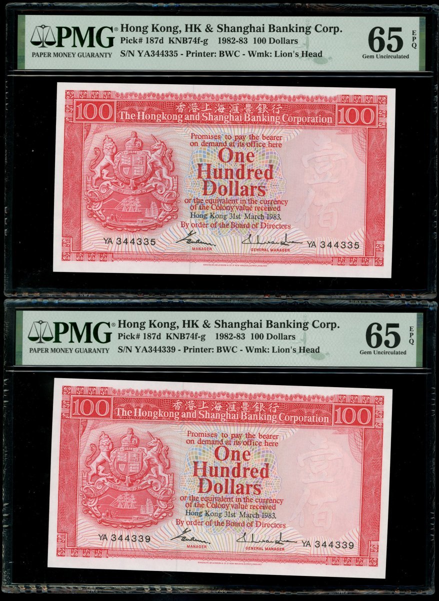 1983年香港上海匯豐銀行100元一組7枚,2組連號YA344331-335,339-340,均PMG 65EPQ