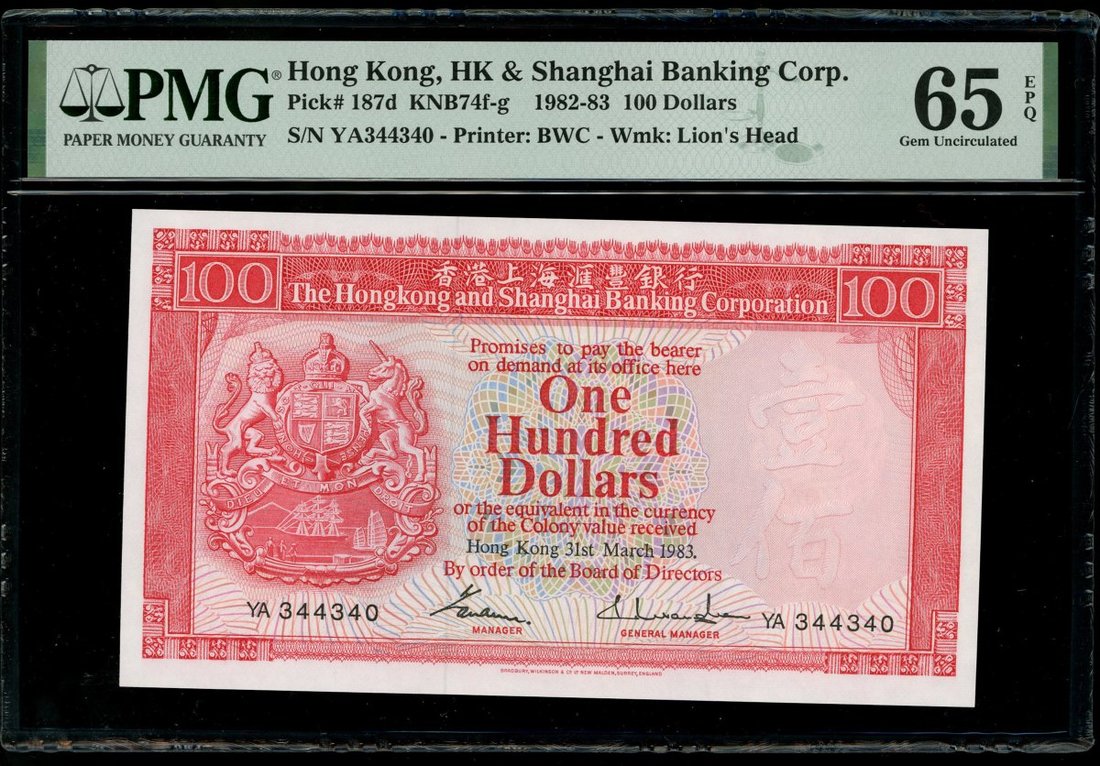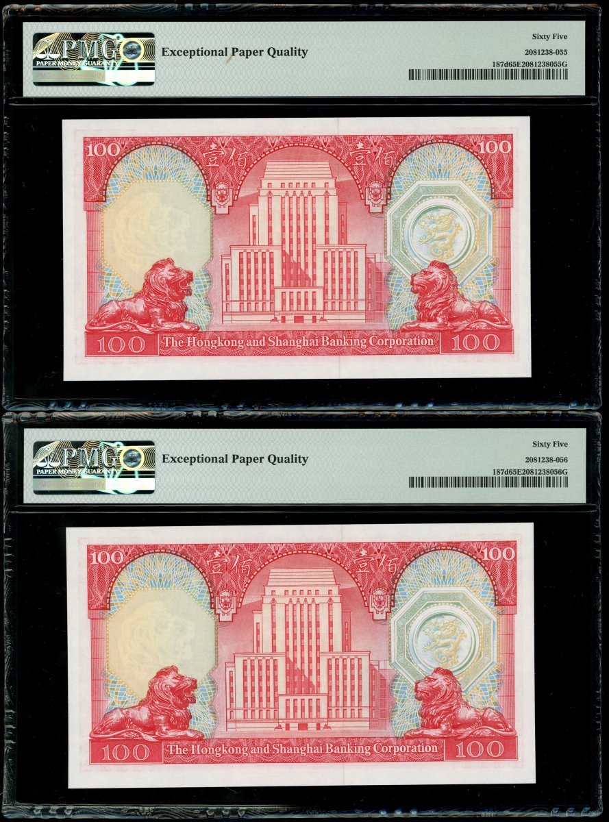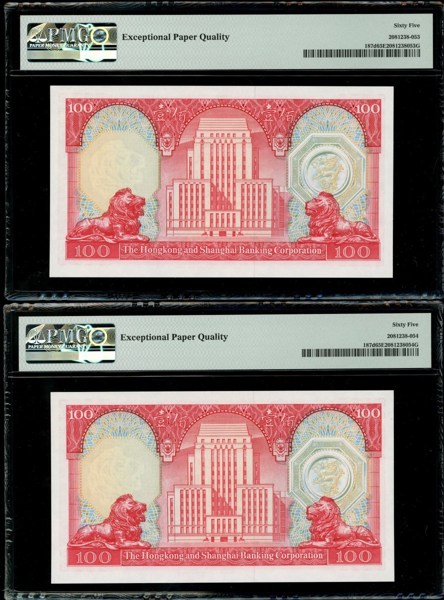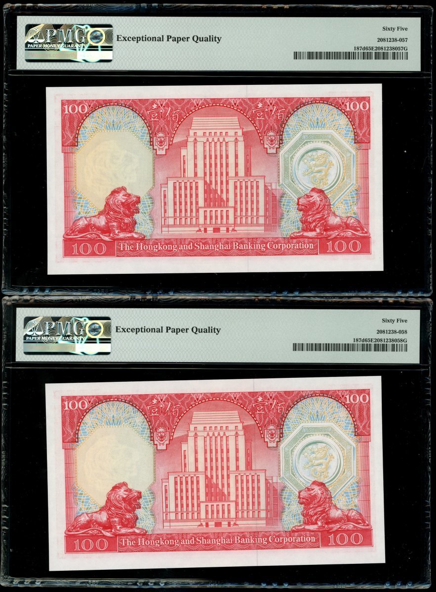 1983年香港上海匯豐銀行100元一組7枚,2組連號YA344331-335,339-340,均PMG 65EPQ