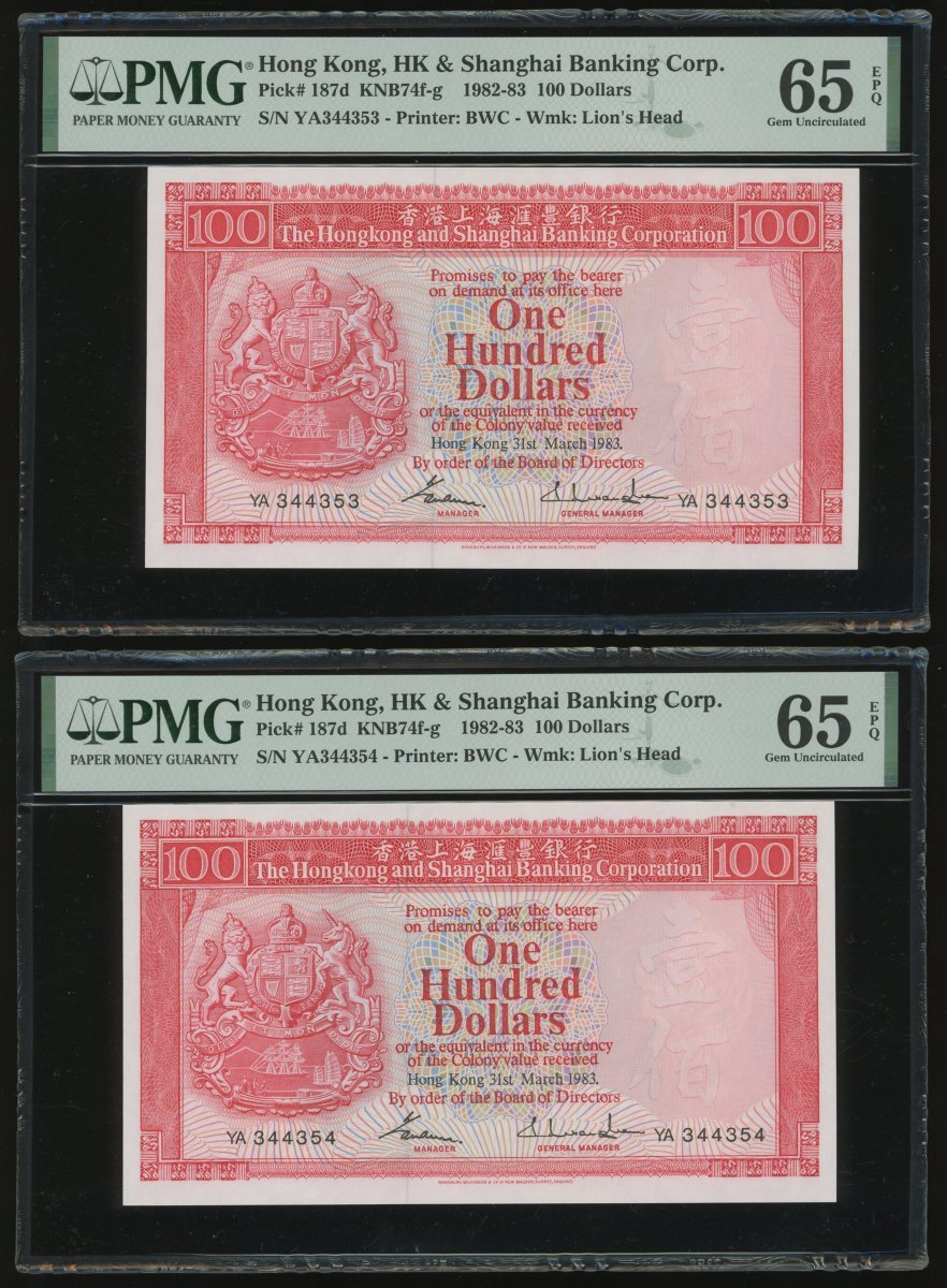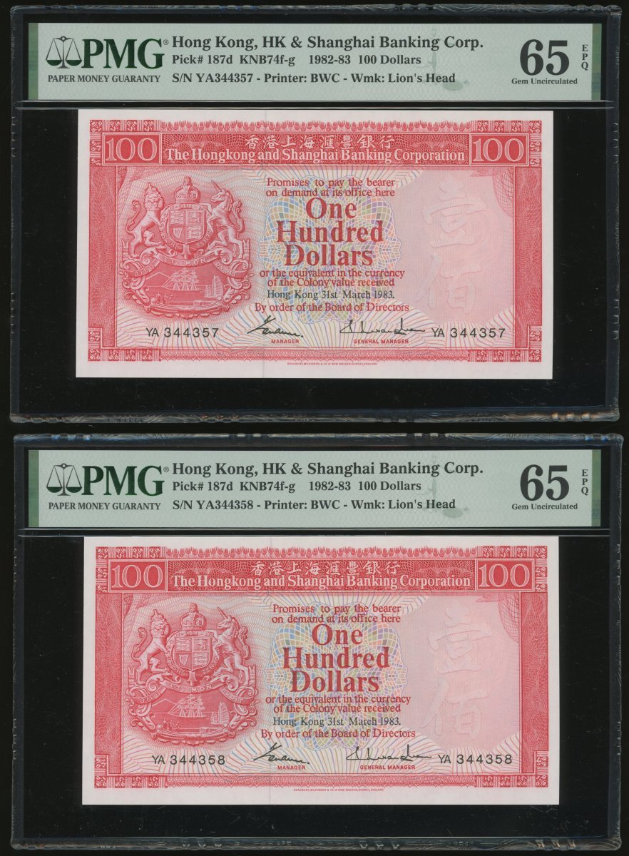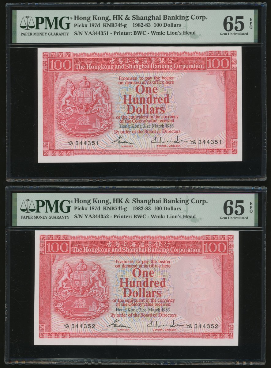 The Hongkong and Shanghai Banking Corporation, a consecutive rum of 10x $100, 31.3.1983, serial numbers YA344351-360, (Pick 187d), all graded PMG 65EPQ Gem Uncirculated (10).