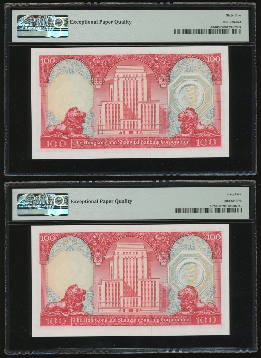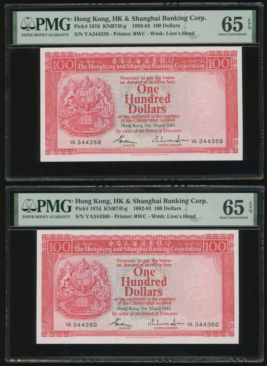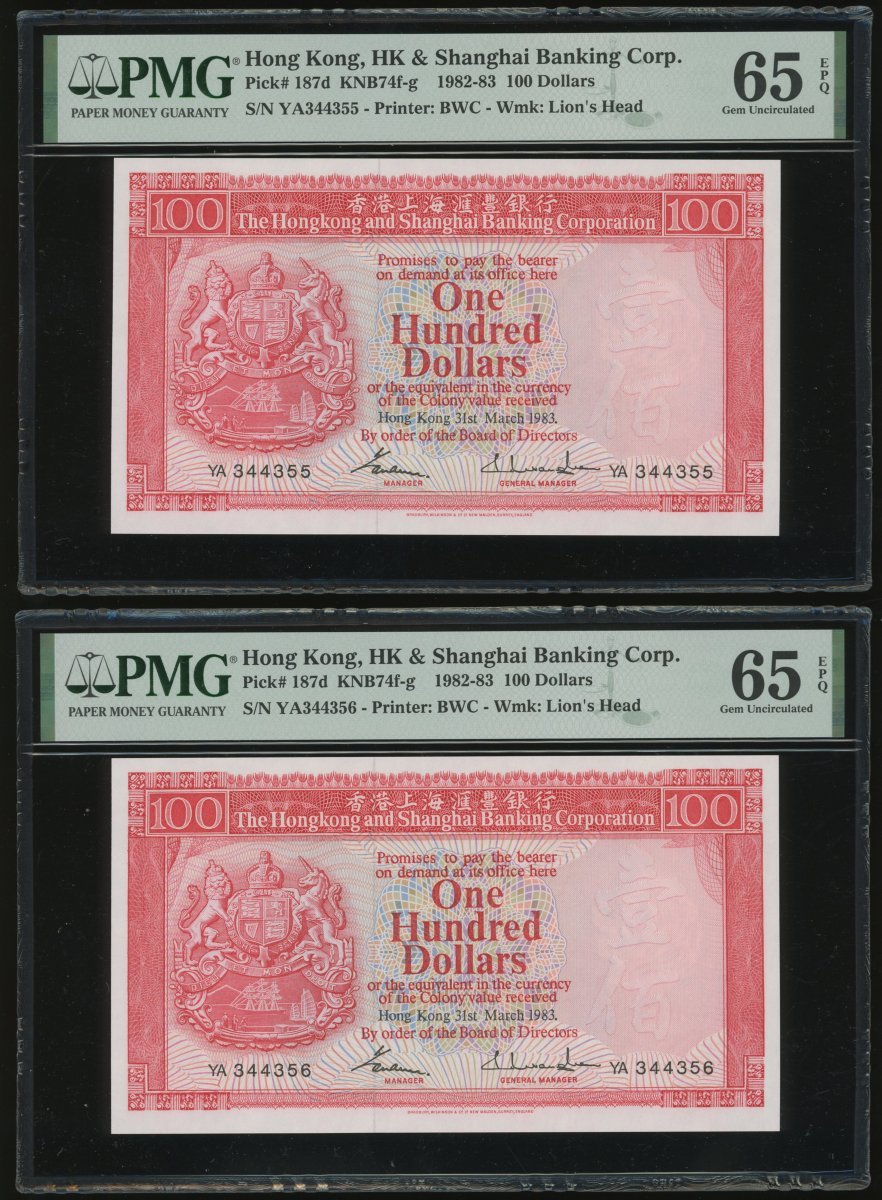 The Hongkong and Shanghai Banking Corporation, a consecutive rum of 10x $100, 31.3.1983, serial numbers YA344351-360, (Pick 187d), all graded PMG 65EPQ Gem Uncirculated (10).