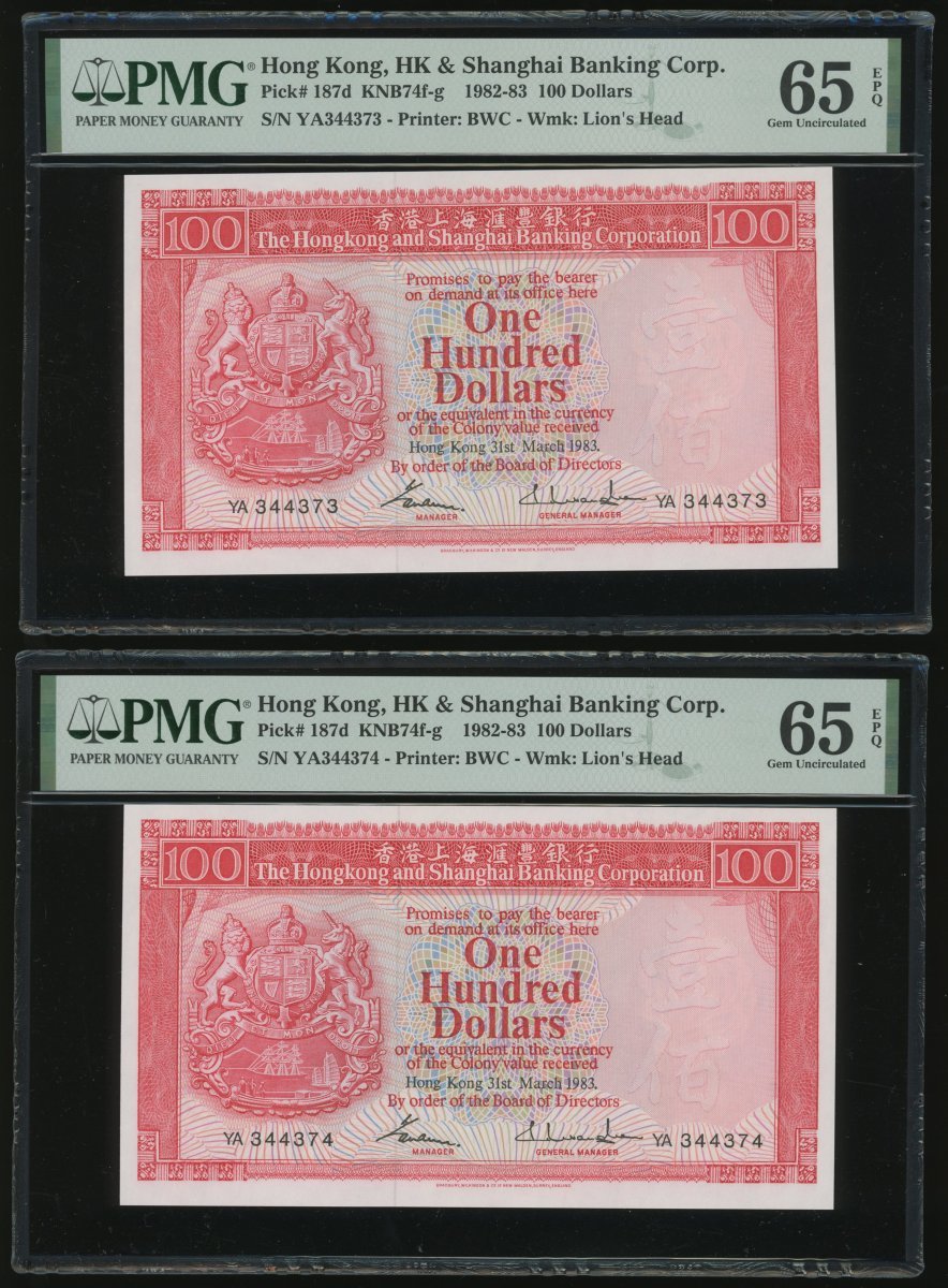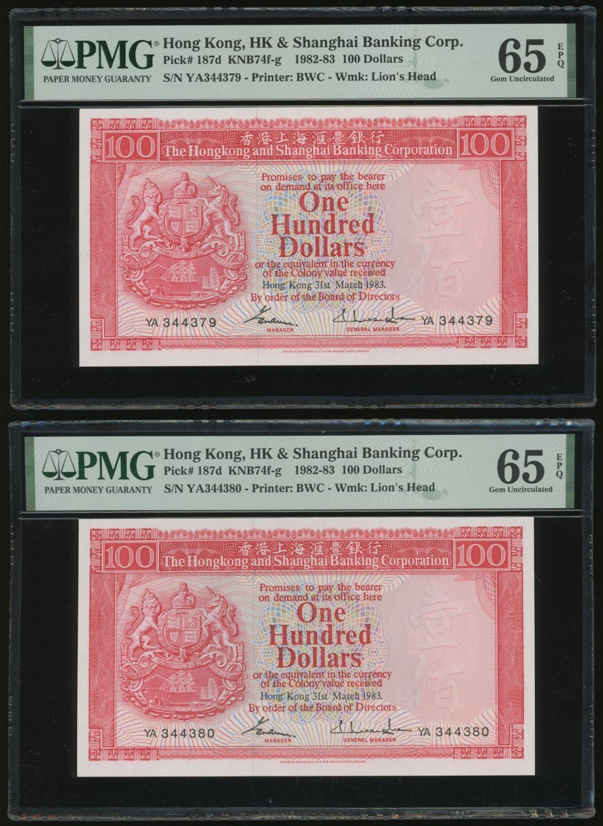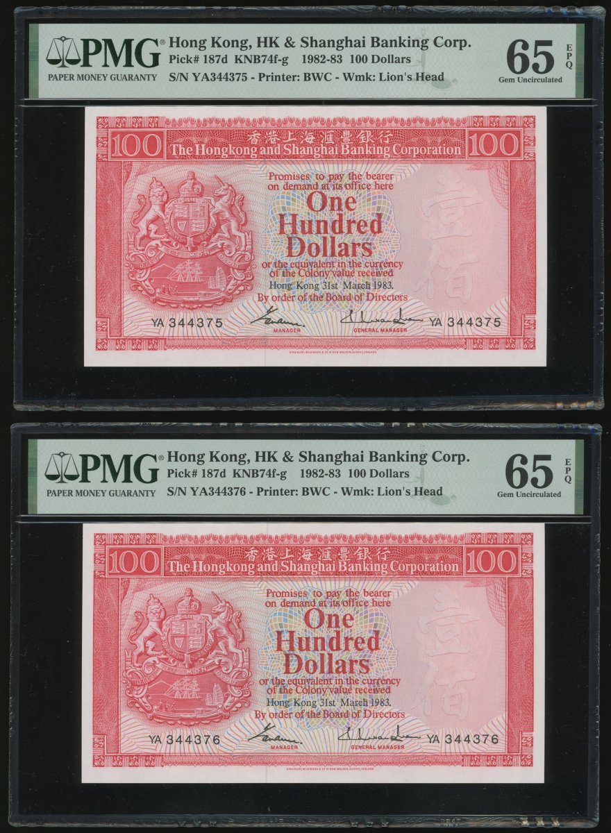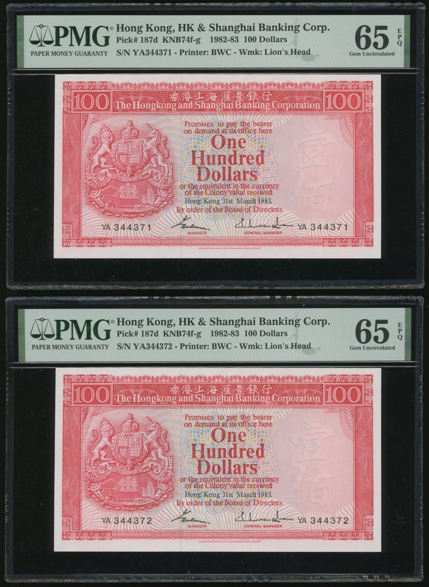 The Hongkong and Shanghai Banking Corporation, a consecutive run of 10x $100, 31.3.1983, serial numbers YA344371-344380, (Pick 187d), all graded PMG 65EPQ Gem Uncirculated (10).