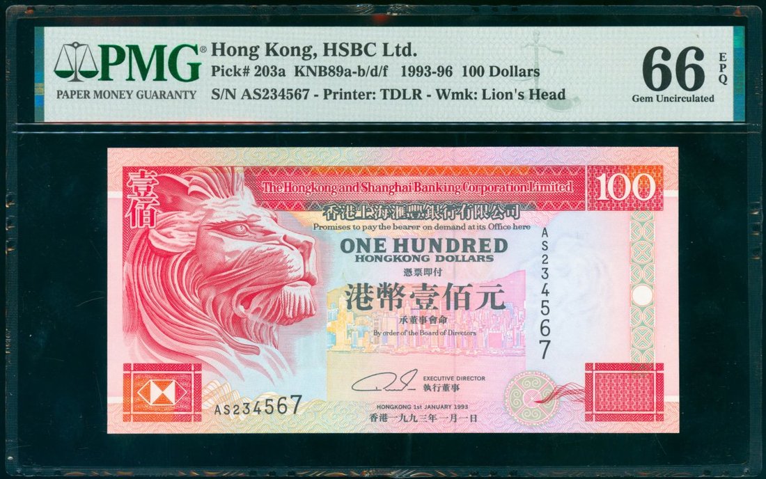 The Hongkong and Shanghai Banking Corporation, $100, 1.1.1993, ascending ladder serial number AS234567, (Pick 203a), PMG 66EPQ Superb Gem Uncirculated.