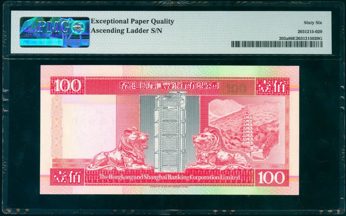 1993年香港上海滙豐銀行 100元,順蛇號AS234567,PMG 66EPQ