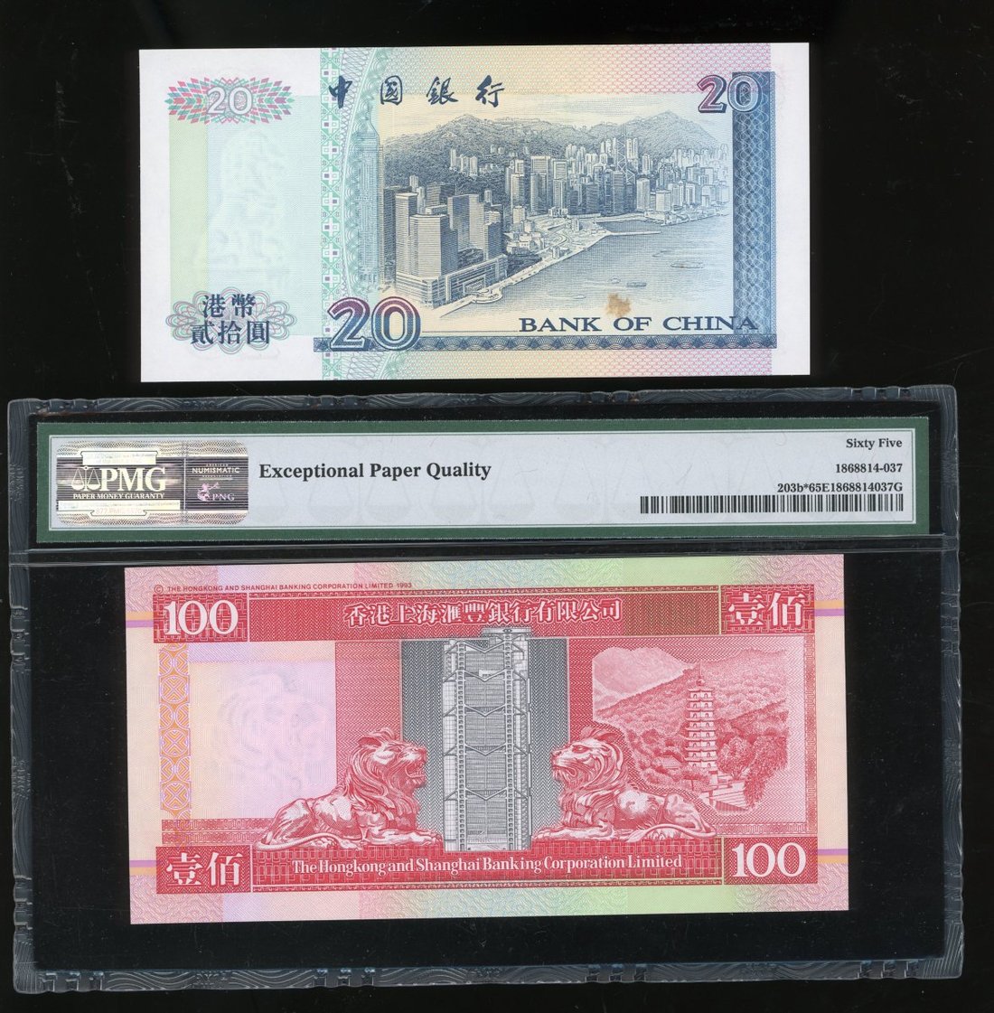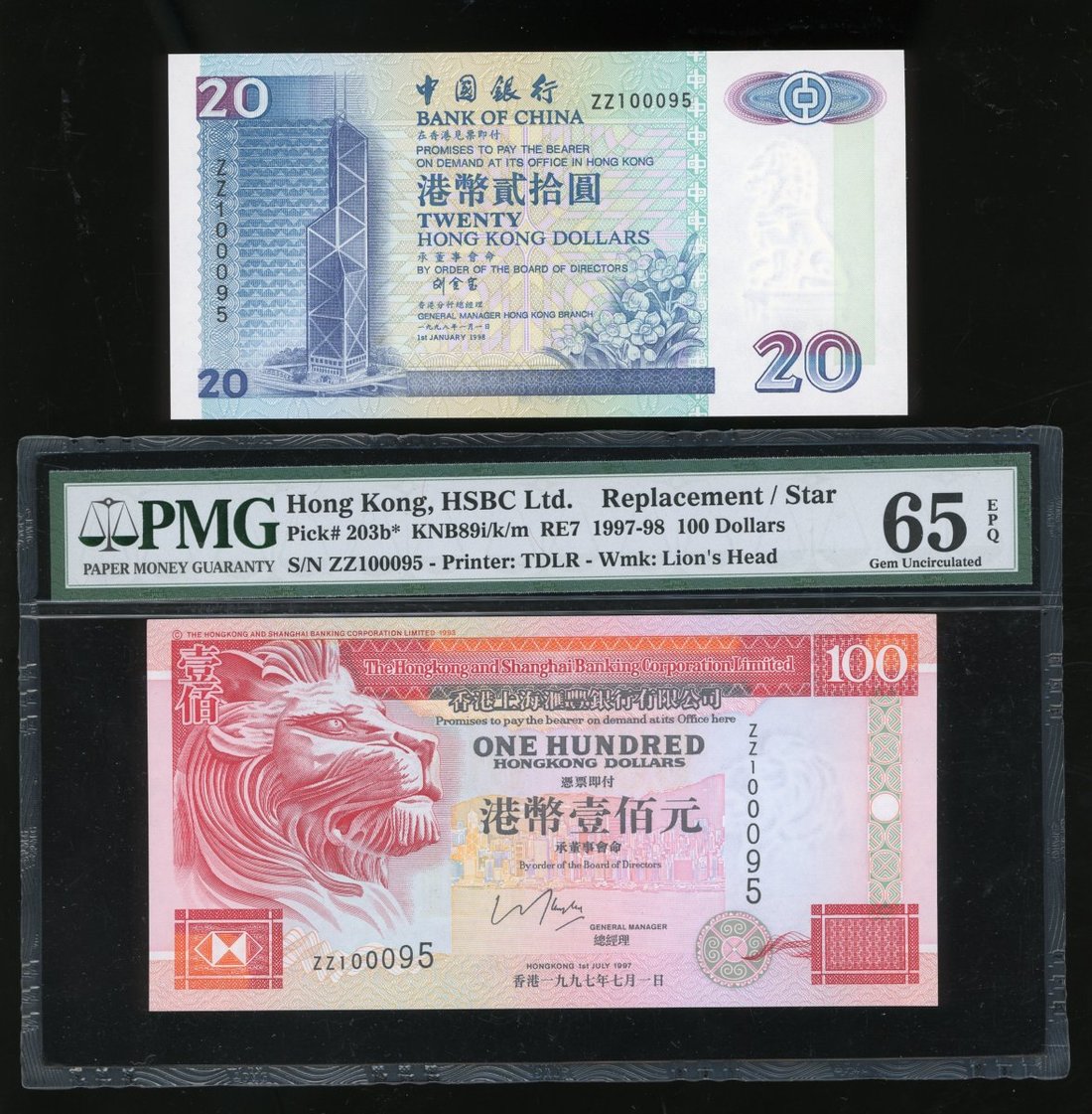 1983年香港上海匯豐銀行100元,補版編號ZZ100095,及1998年中國銀行20元,相同編號ZZ100095,分別PMG 65EPQ,20元UNC,背有黃