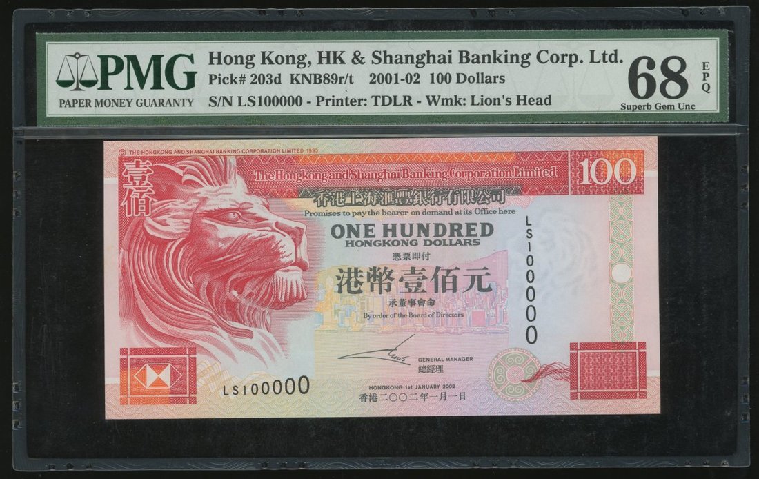 The Hongkong and Shanghai Banking Corporation, $100, 1.1.2002, serial number LS100000, (Pick 203d), PMG 68EPQ Superb Gem Uncirculated