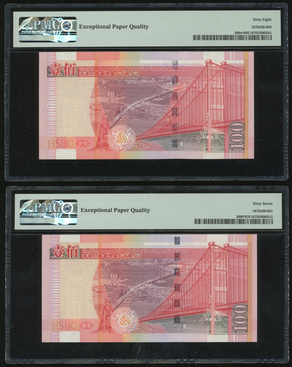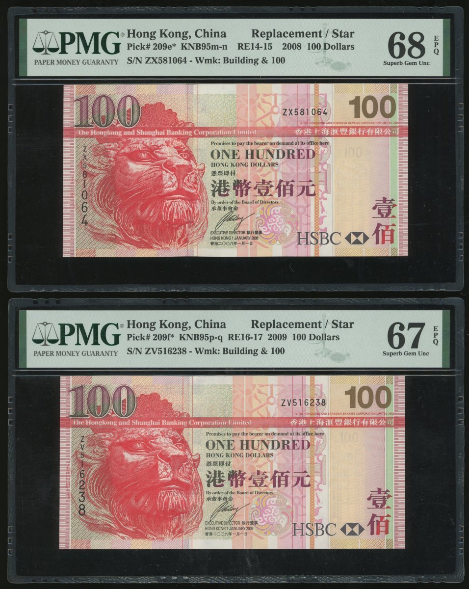 The Hongkong and Shanghai Banking Corporation, 2x $100, 1.1.2008 and 1.1.2009, replacement serials ZX581064 and ZV516238, (Pick 209e*, 209f*), graded PMG 68EPQ and 67EPQ respectively (2)