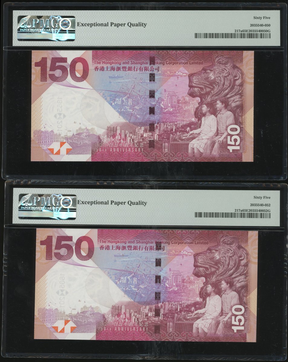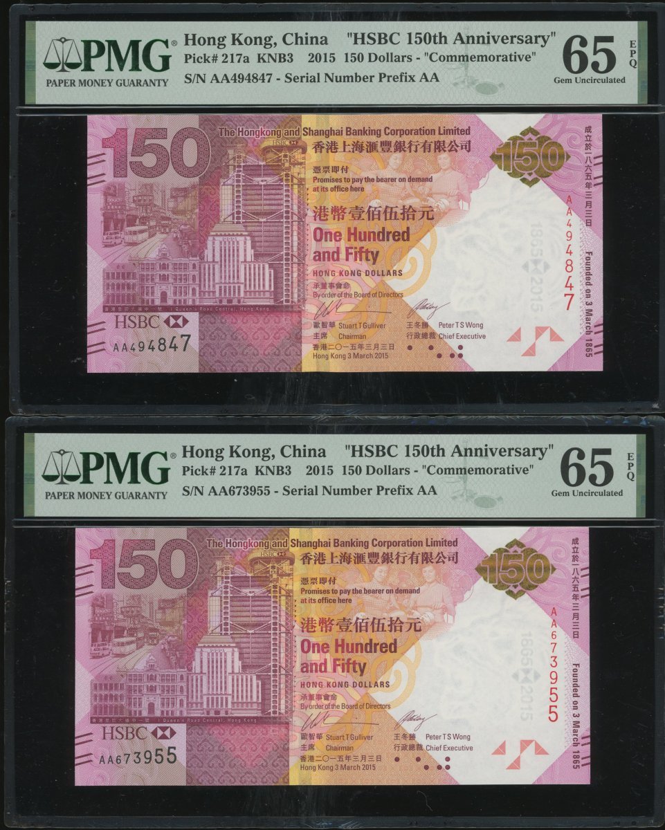 The Hongkong and Shanghai Banking Corporation, a pair of $150, 3.3.2015, 150th anniversary of the bank, AA prefix serial numbers AA494847 and AA673955, (Pick 217a), both graded PMG 65EPQ Gem Uncirculated (2)