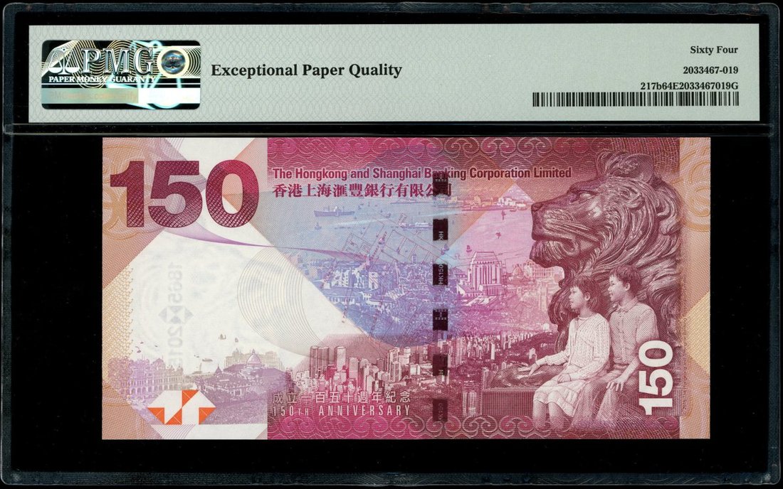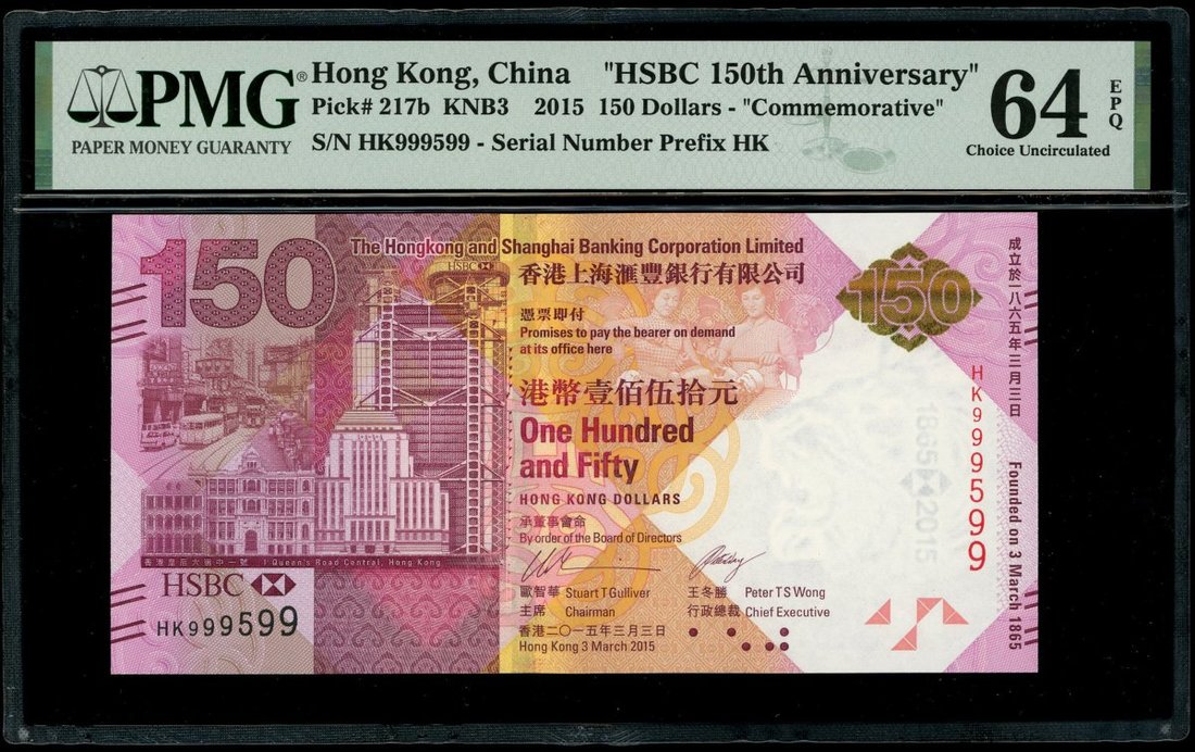 2015年香港上海匯豐銀行成立150週年紀念150元,編號HK999599,PMG 64EPQ
