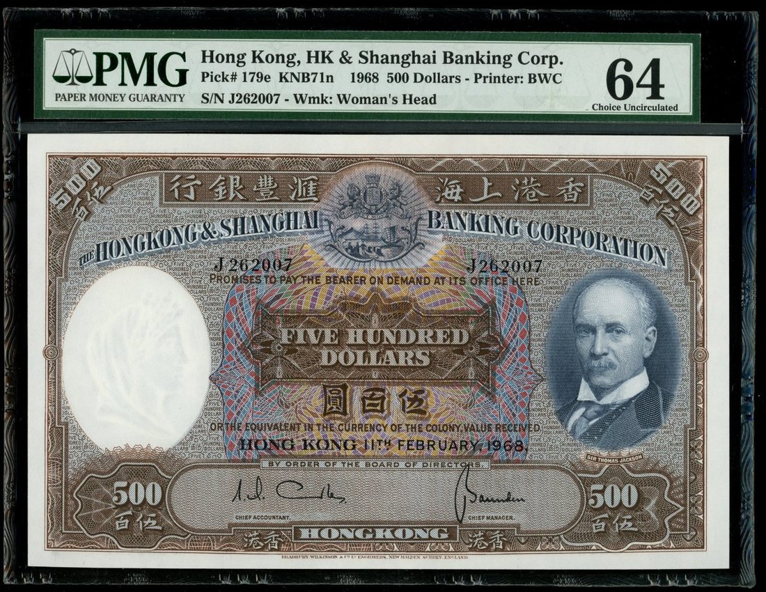 The Hongkong and Shanghai Banking Corporation, $500, 11.2.1968, serial number J262007, (Pick 179e), PMG 64 Choice Uncirculated