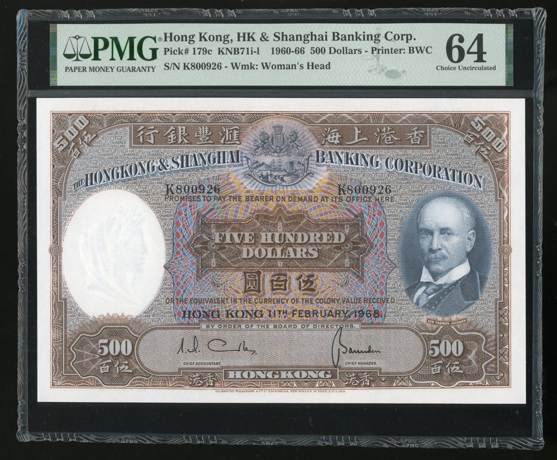 The Hongkong and Shanghai Banking Corporation, $500, 11.2.1968, serial number K800926, (Pick 179c), PMG 64 Choice Uncirculated