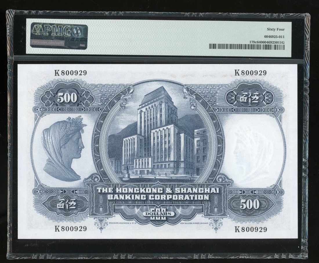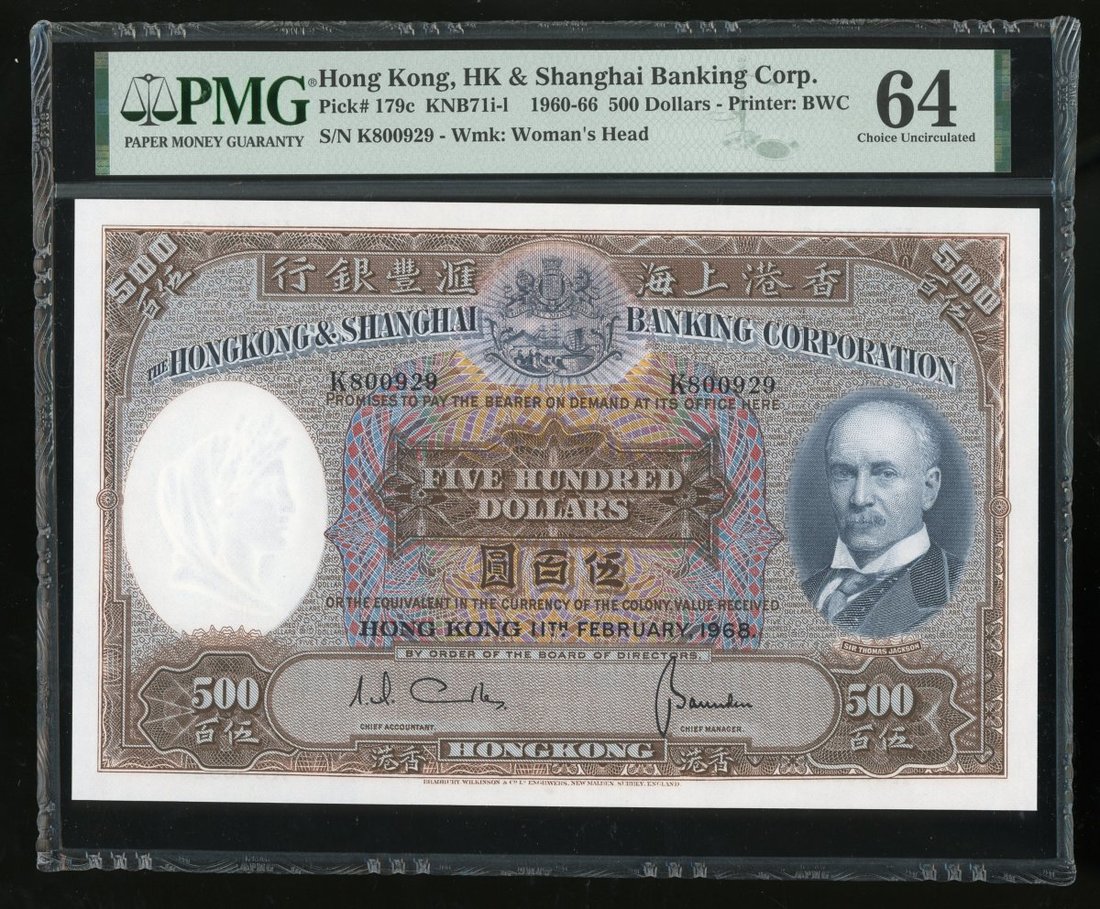 The Hongkong and Shanghai Banking Corporation, $500, 11.2.1968, serial number K800929, (Pick 179c), PMG 64 Choice Uncirculated