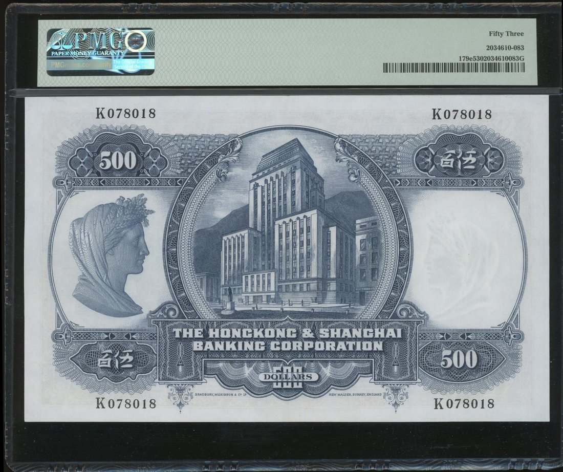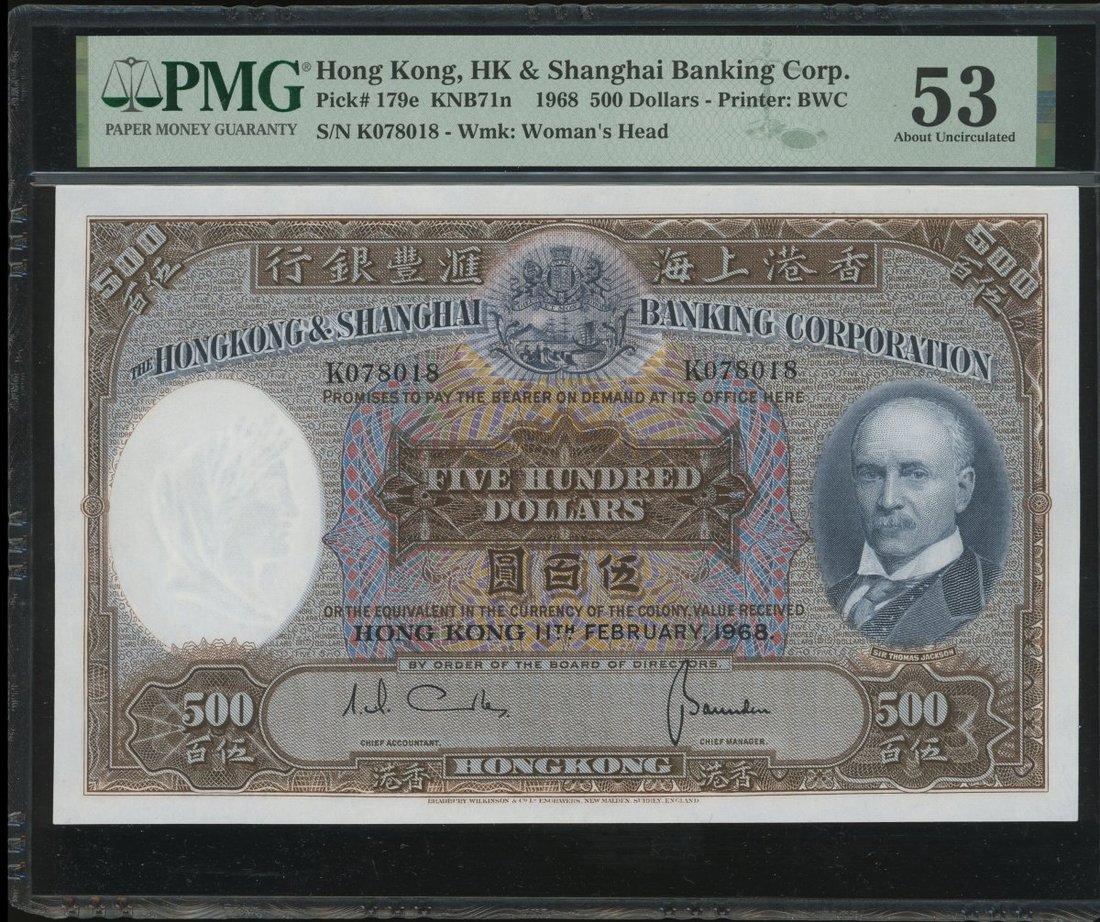 1968年香港上海匯豐銀行500元,編號K078018,PMG 53