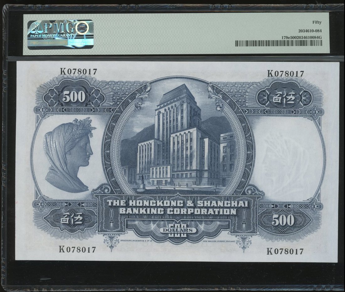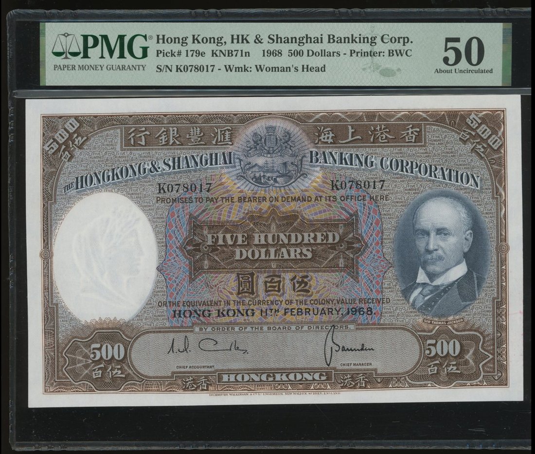 The Hongkong and Shanghai Banking Corporation, $500, 11.2.1968, serial number K078017, (Pick 179e), PMG 50 About Uncirculated