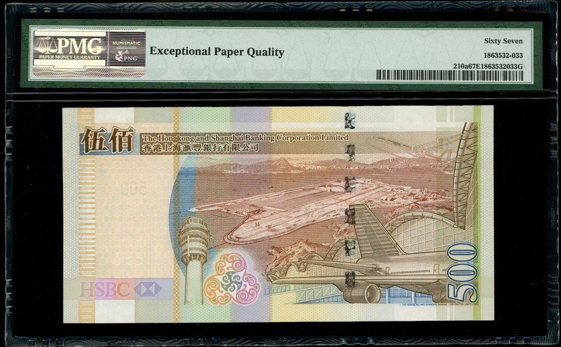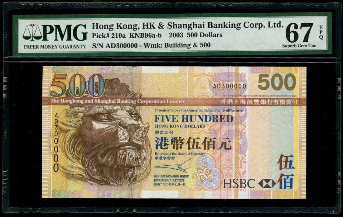 2007年香港上海匯豐銀行500元,趣味號 AD300000,PMG 67EPQ