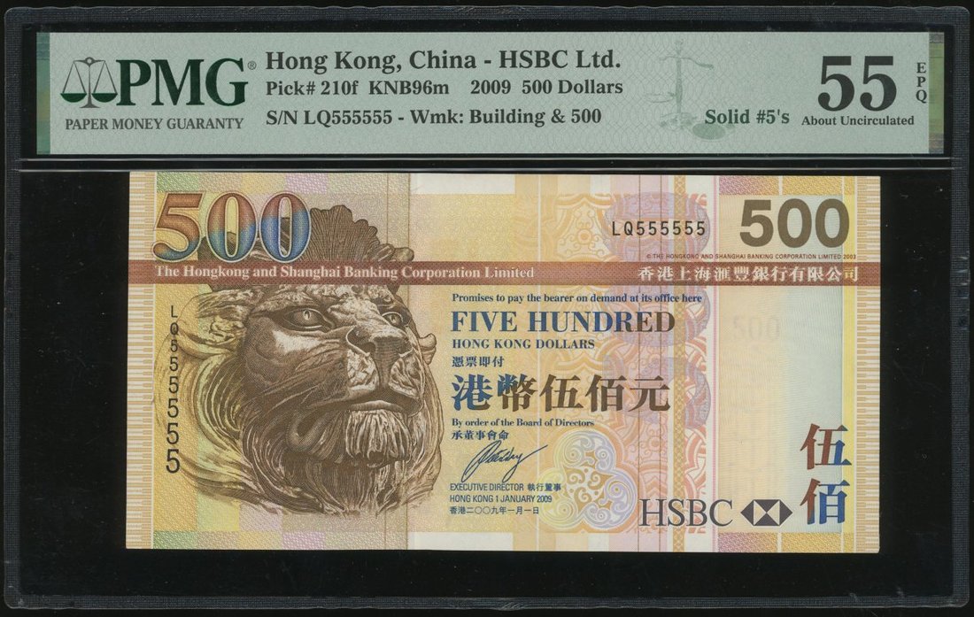 The Hongkong and Shanghai Banking Corporation, $500, 1.1.2009, solid serial number LQ555555, (Pick 210f), PMG 55EPQ About Uncirculated