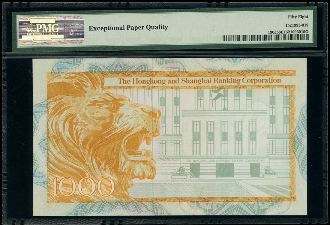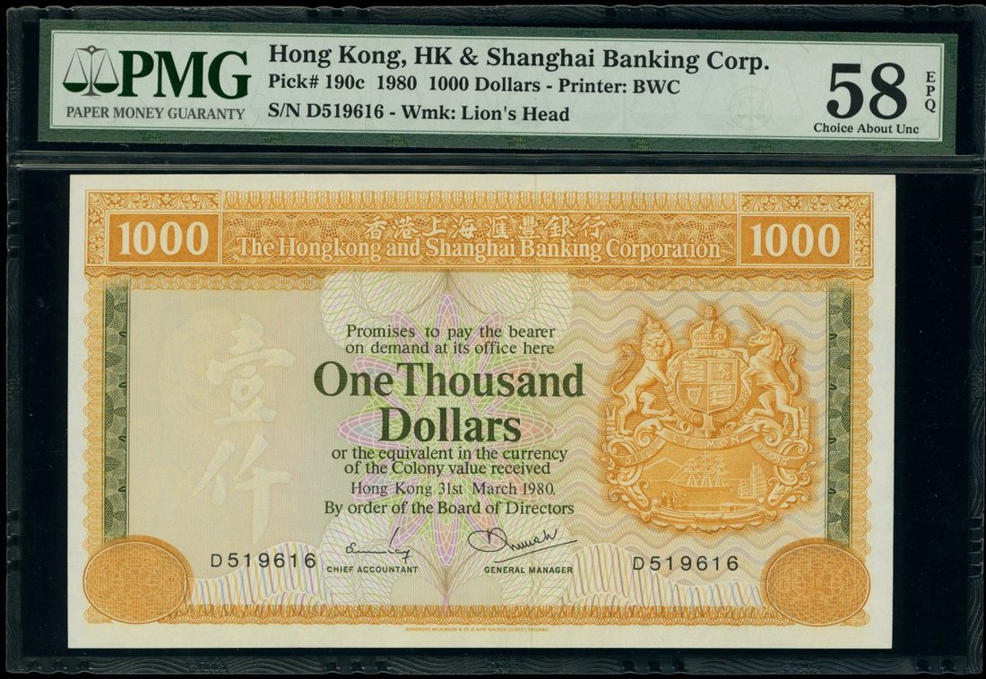 1980年香港上海匯豐銀行1000元,編號D519616,PMG 58EPQ,罕見年份