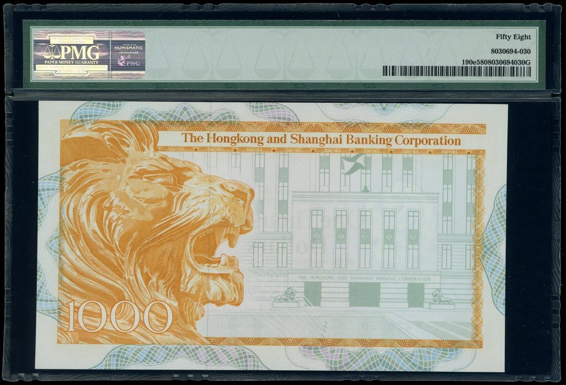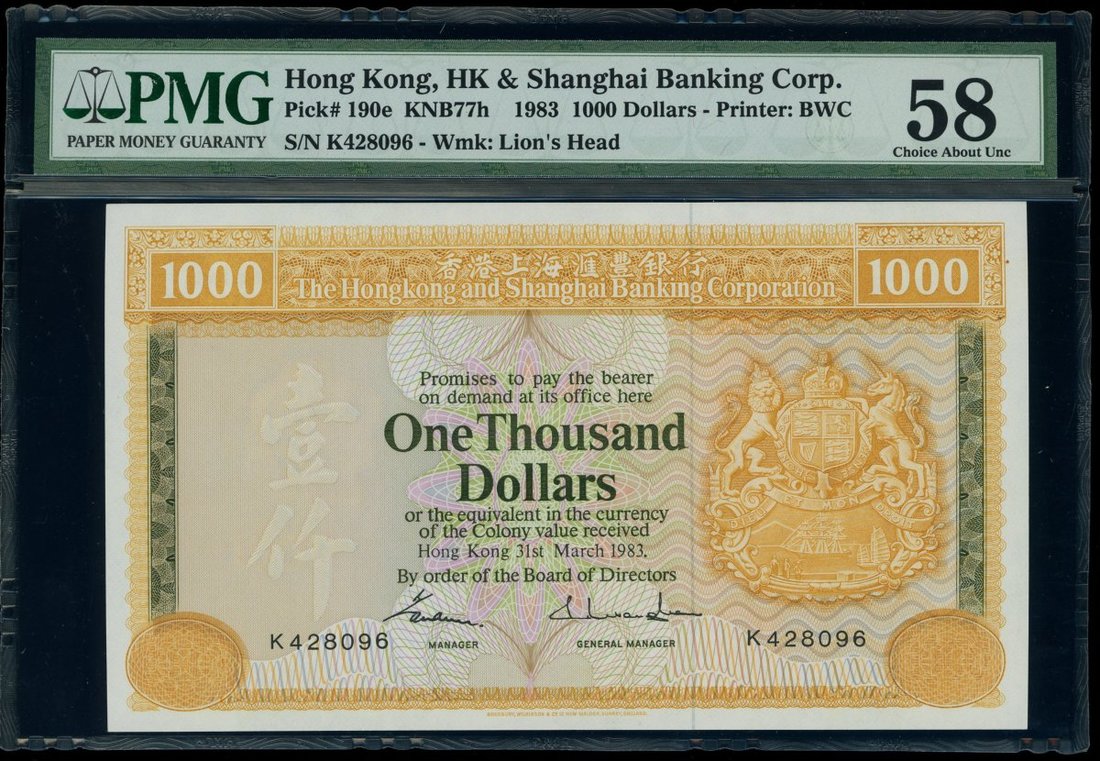 Hong Kong & Shanghai Banking Corporation, $1000, 31.3.1983, serial number K428096, (Pick 190e), PMG 58, choice about uncirculated.