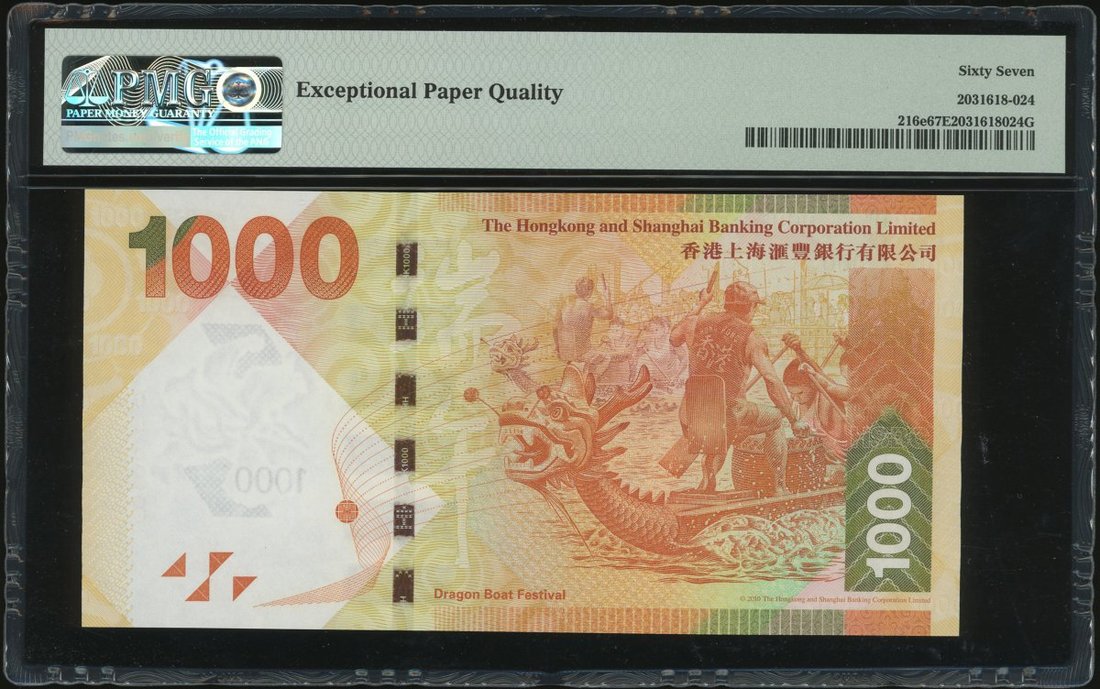2016年香港上海匯豐銀行1000元,趣味號GU306888,PMG 67EPQ
