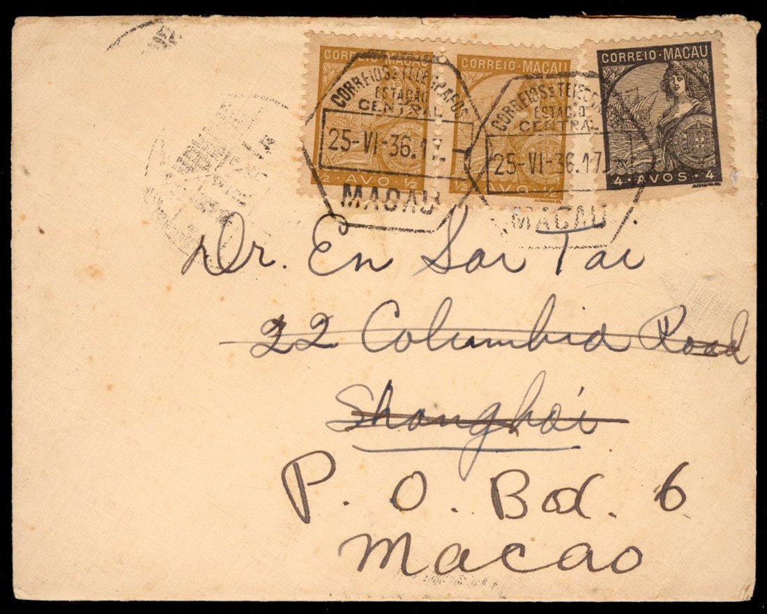 1936 (25 Jun.) envelope to Shanghai bearing Padroes 1/2a. pair and 4a. tied by Macau c.d.s., then return to Macau (10.7), receiver Dr. En Sai Tai was Dr. Sun Yat-Sen' s son-in-law.