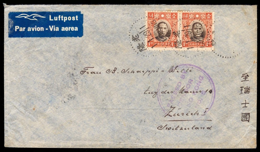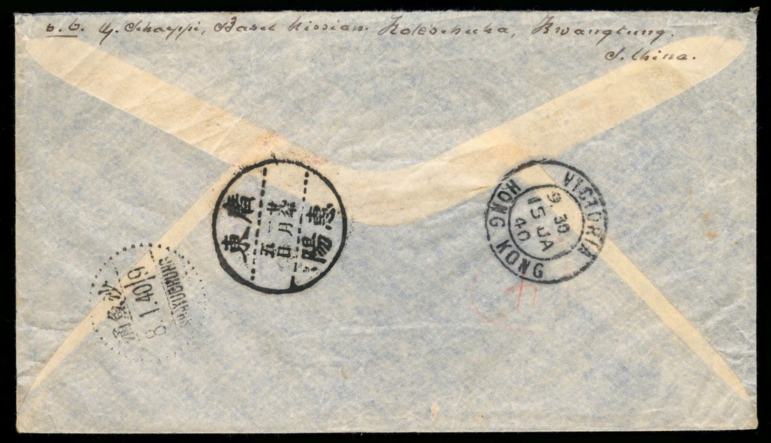 1940年1月1日廣東老隆寄瑞士航空封, 貼孫像壹圓票两枚. 銷老隆日戳. 封背蓋1月5日惠陽及1月8日沙魚涌中英文日戳, 及香港1月15日中轉戳. 按: 沙魚涌封片存世考圖錄編號Y022. * 封面上的香港第二型圓形雙圈藍色檢查戳 "Passed by Censor Hong Kong No.5", 使用期由1939年12月18日起計, 只用了十八天. , 品相中上, 罕品.