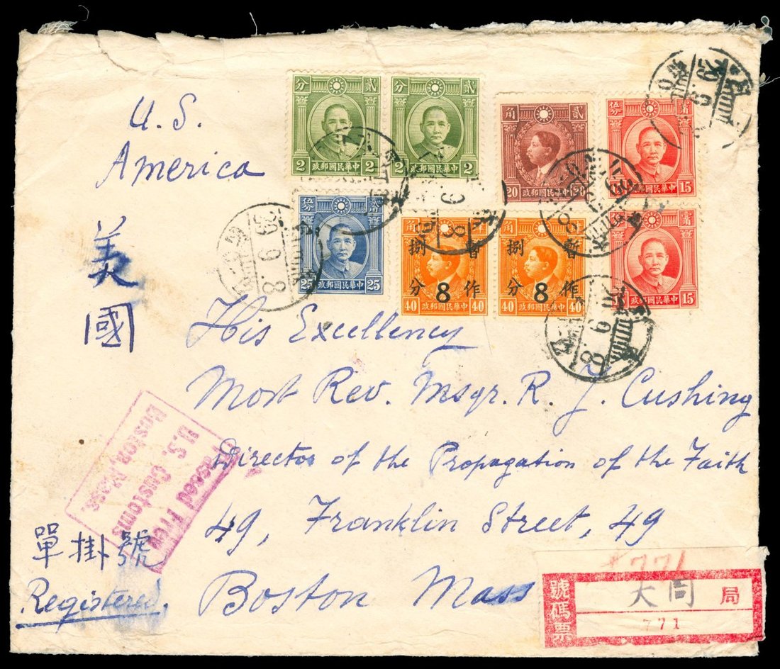 1940年大同寄美國掛號封1件,貼倫敦一版孫像2分2枚,紅15分2枚,25分1枚,京烈20分1枚,烈士加蓋暫作捌分2枚,銷大同9月8日戳,另蓋偽蒙疆掛號戳,經上海中轉有12日戳,及美國10月11日波士頓到達戳,保存完好