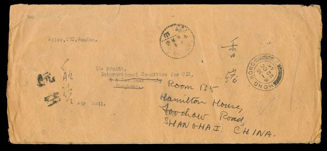 1946 (9 Oct.) air mail envelope to Hong Kong bearing $20 on 8c. (19) tied by Sandan c.d.s. via Lanchow (14.10), Hong Kong (22.10) arrival c.d.s., re-direct to Shanghai (26.10) very fine.