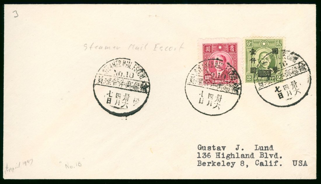 1947 (7 Apr.) paquebot cover to U.S.A. bearing $100 and $1000 on 2c. tied by "STEAMER MAIL ESCORT No.10" c.d.s., very fine.