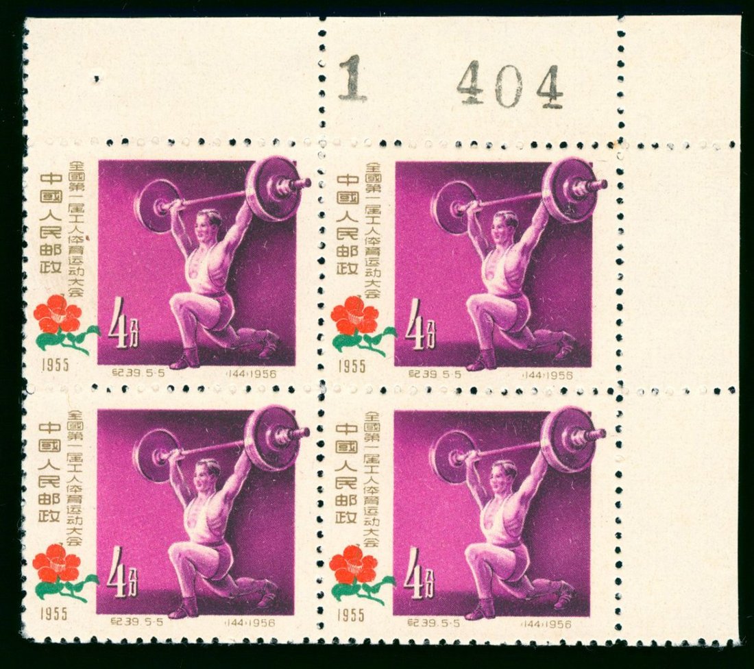 1957年紀39第一屆工人體育運動會新票四方連1套,均帶右上直角邊紙,邊紙均有流水號,票面顏色鮮豔,齒孔完整,整體品相佳