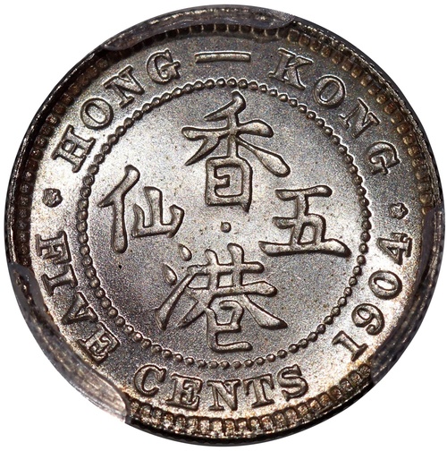 Hong Kong, silver 5 cents, 1904, slightly toned on obverse, PCGS MS67, top pop, rare. Cert.#42978956