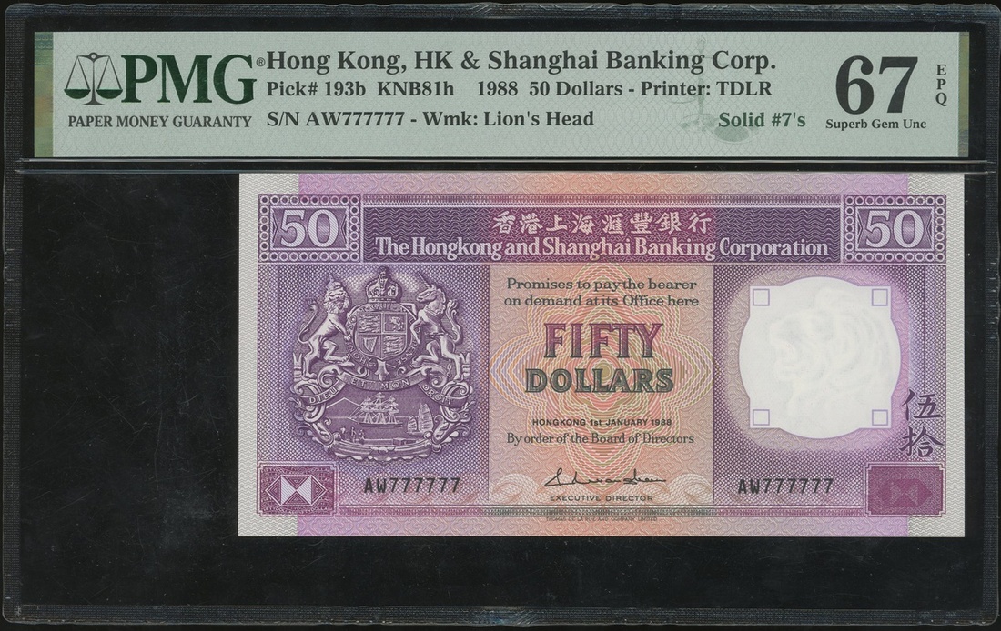 The Hongkong and Shanghai Banking Corporation, $50, 1.1.1988, lucky serial number AW777777, (Pick 193b), PMG 67EPQ Superb Gem Uncirculated, the second highest grade in PMG population report and only 8 notes are graded higher at 68EPQ!