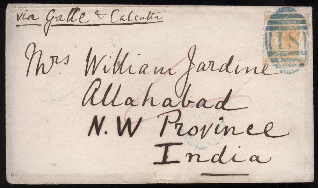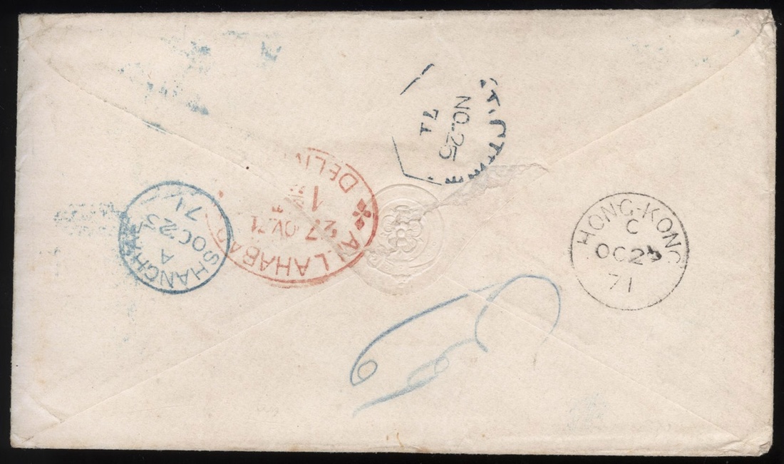 1871 (25 Oct.) An envelope to Allahabad, India(27.11) "via Galle and Calcutta" and Hong Kong(28.11) bearing Q.V. 8c. pale dull orange tied by "S1", with "Shanghae/A" origin c.d.s. on reverse, fine.