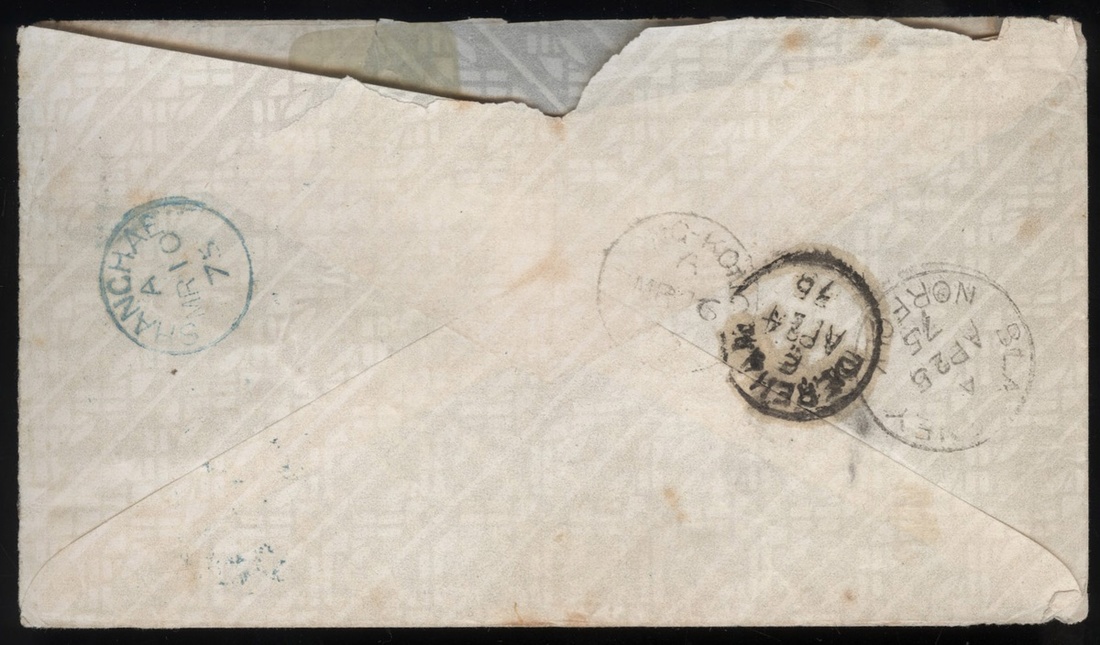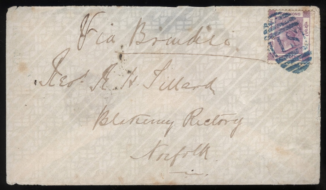 1875 (10 Mar.) An envelope to Norfolk, England(25.4) "via Brindisi" and Hong Kong(16.3) bearing Q.V. 30c. mauve tied by "S1" in blue with "Shanghai/A" origin c.d.s. on reverse, fine.