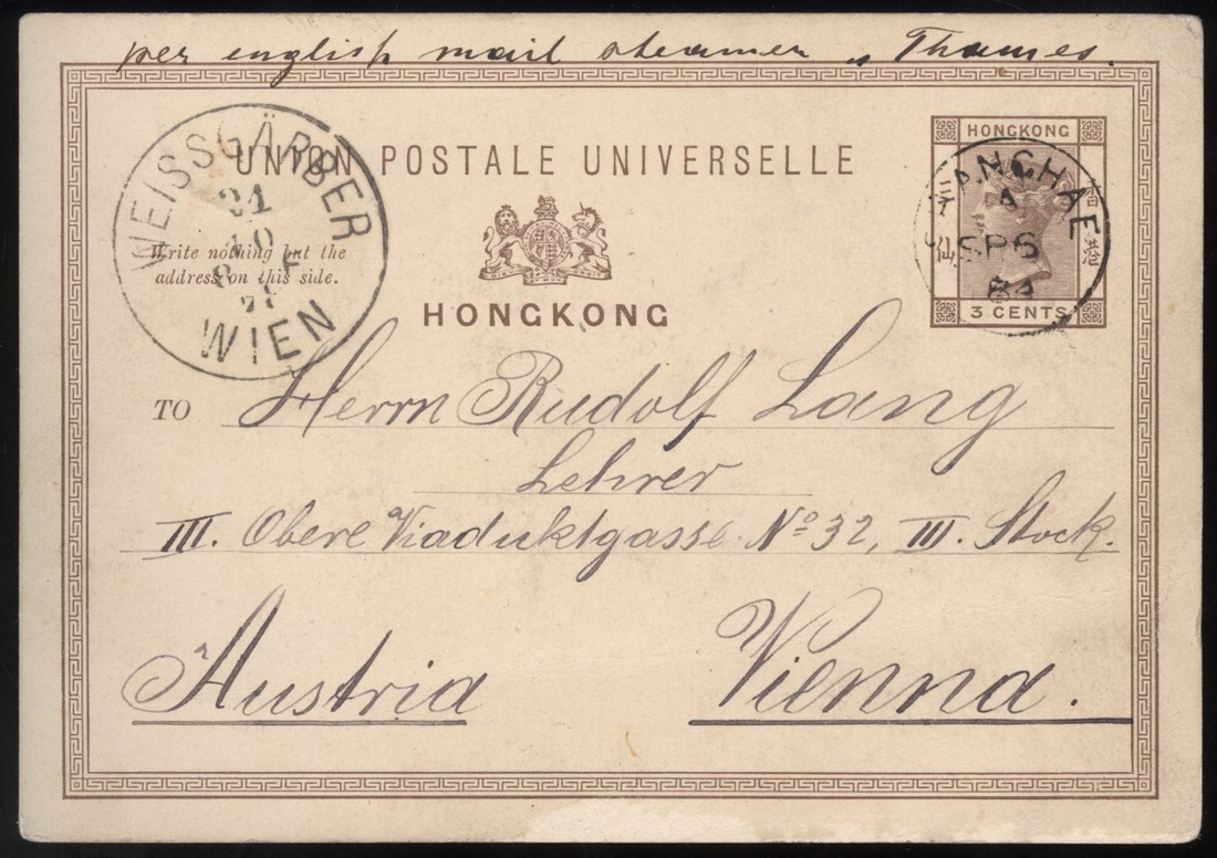 1884 (6 Sep.) Q.V. 3c. stationery card via Hong Kong(10.9) to Austria tied by Shanghae/A c.d.s., Wien(21.10) arrival c.d.s., very fine.
