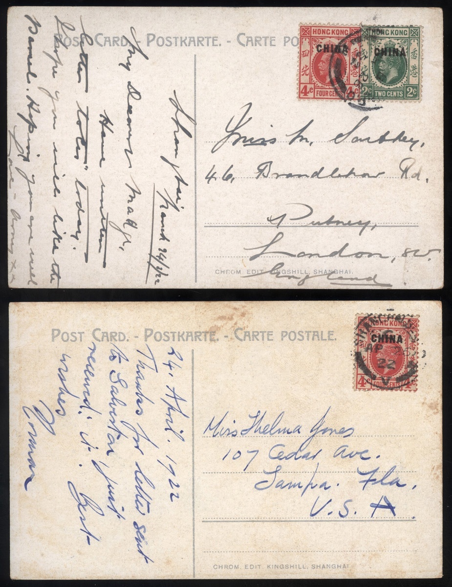 1922年上海寄海外明信片2件,分別貼香港國王像加蓋CHINA4分及2分,郵資分別為4分及6分,均銷上海英國客郵局日戳,片背分別為上海龍華寶塔,上海外灘碼頭,整體保存完好,其中貼英國客郵6分郵資明信片少見