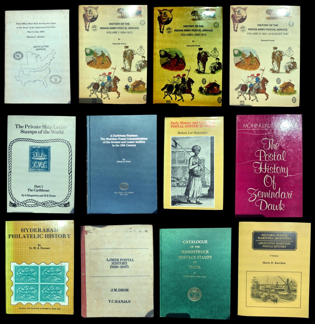 A group of 12 literature including: 1) Post Office Mail Sent Across the Lines at the Start of the American Civil War May to July 1861 by Steven C. Walske; 2) A Caribbean Neptune: The Maritime Postal Communications of the Greater and Lesser Antilles in the 19th Century by Robert G.Stone; 3) The Private Ship Letter Stamps of the World Part 1 The Caribbean by S.Ringstrom and H.E. Tester; 4) Catalogue of the Handstruck Postage Stamps of India by D. Hammond Giles, M.B.E.; 5) Ajmer Postal History (1820-1947) by J.M. Dhor and T.C.Ranjan; 6) Hyderabad Philatelic History by Dr M.A.Nayeem; 7) Historia Postal Maritima Argentina 3rd Edition by Mario D. Kurchan; 8) Early History and Growth of Postal System in India by Mohini Lal Majumdar; 9) The postal History of Zemindari Dawk; 10-12) History of the Indian Army Postal Service Volume I, II and III.