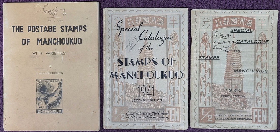 1940-41 Catalogue of Manchukuo by Schumann in Shanghai first and second editions, 1940 The Postage stamps of Manchukuo by J. Haag-Pedersen, good to fine.